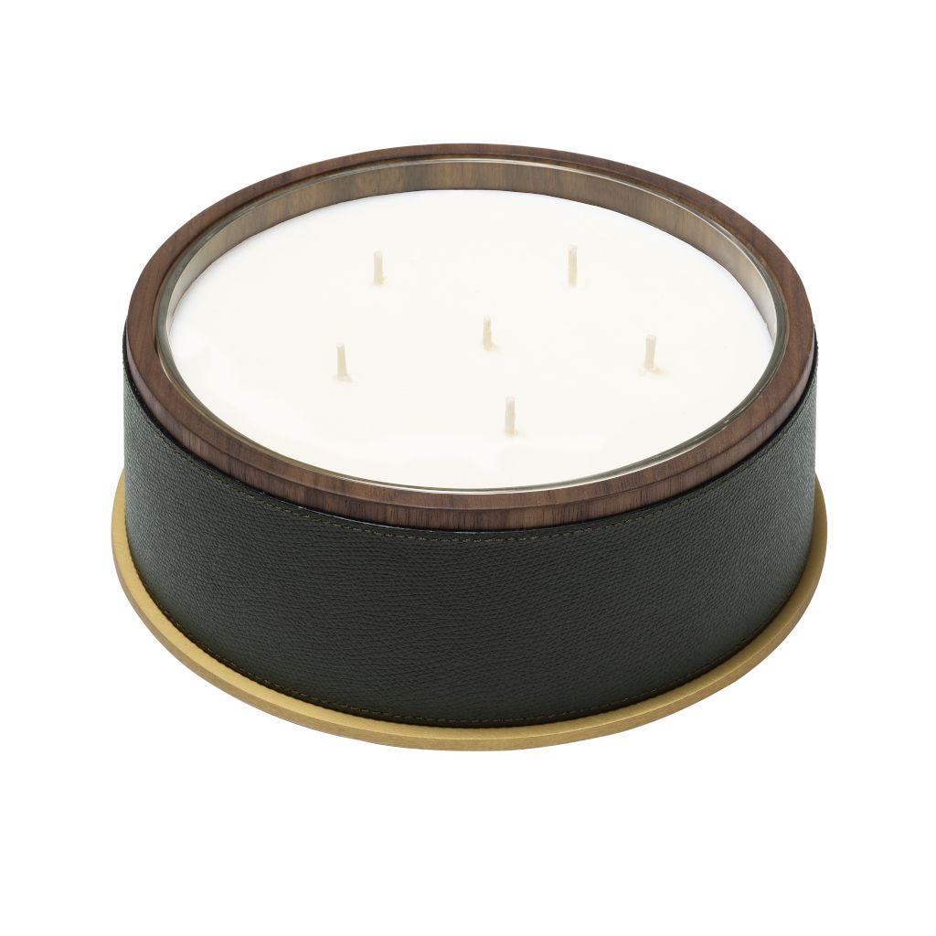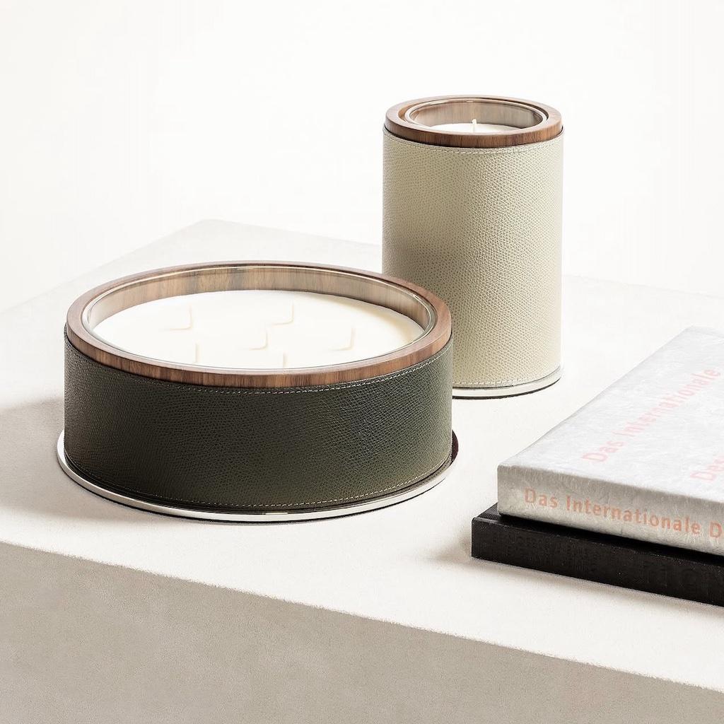 A removable wax candle rests within, while the outer leather insert brings a sleek, distinctive touch and a subtle contrast of textures.