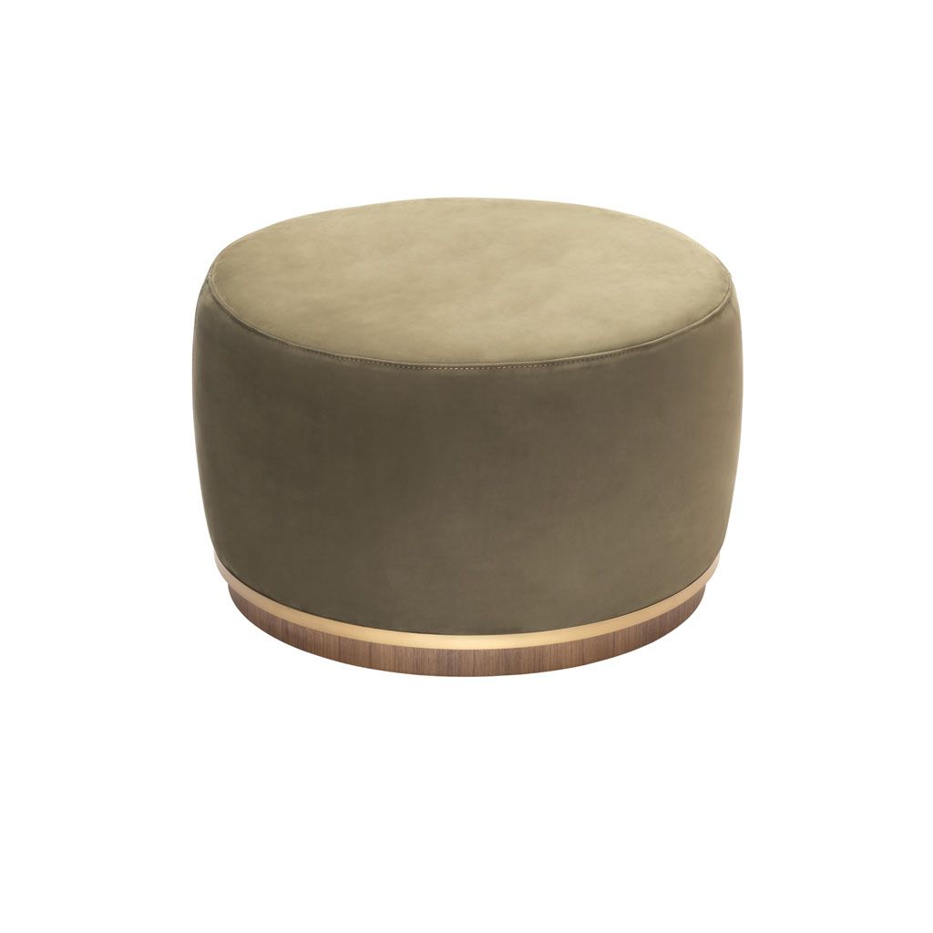 Upholstered leather pouf featuring a wooden base decorated with a fine metal ring.