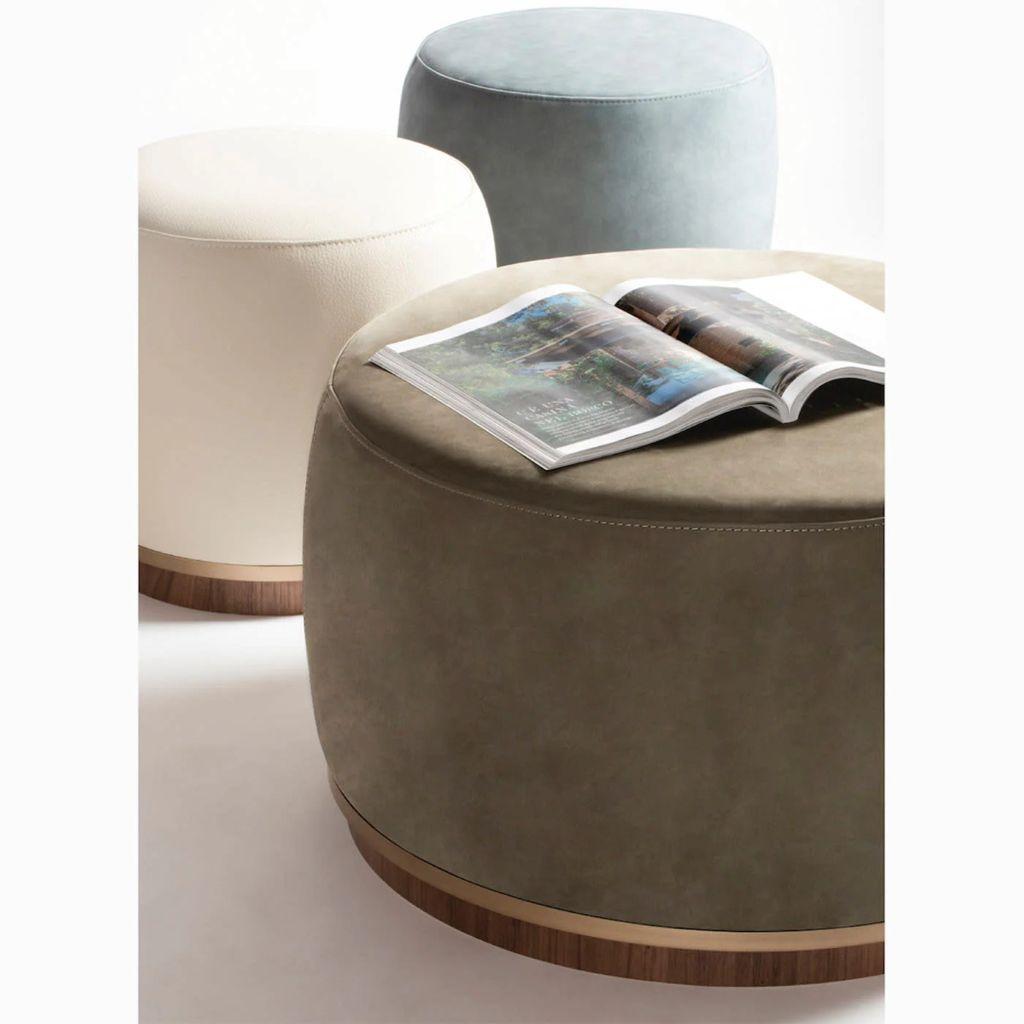 Upholstered leather pouf featuring a wooden base decorated with a fine metal ring.