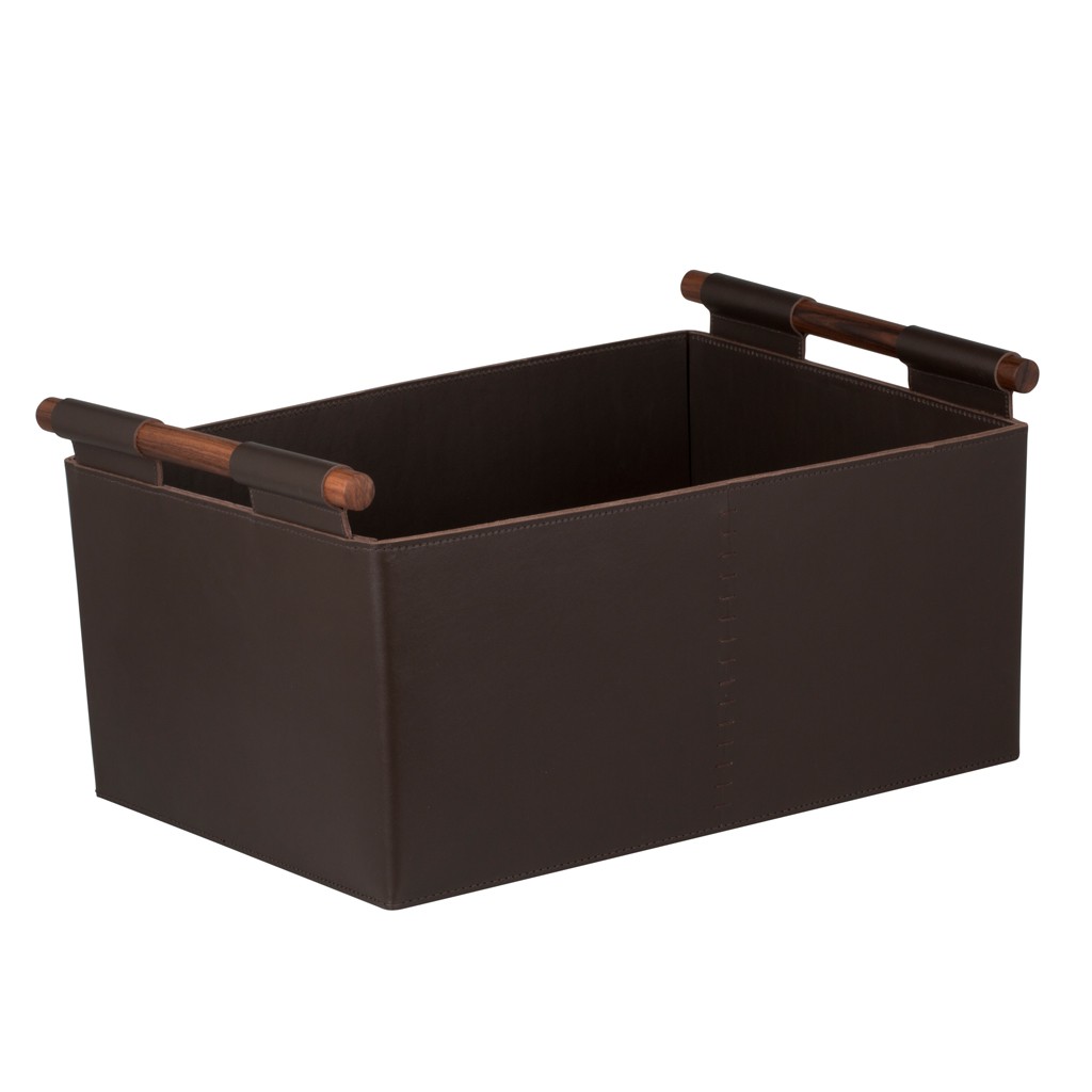 Water resistant saddle leather storage basket with solid palisander handles.