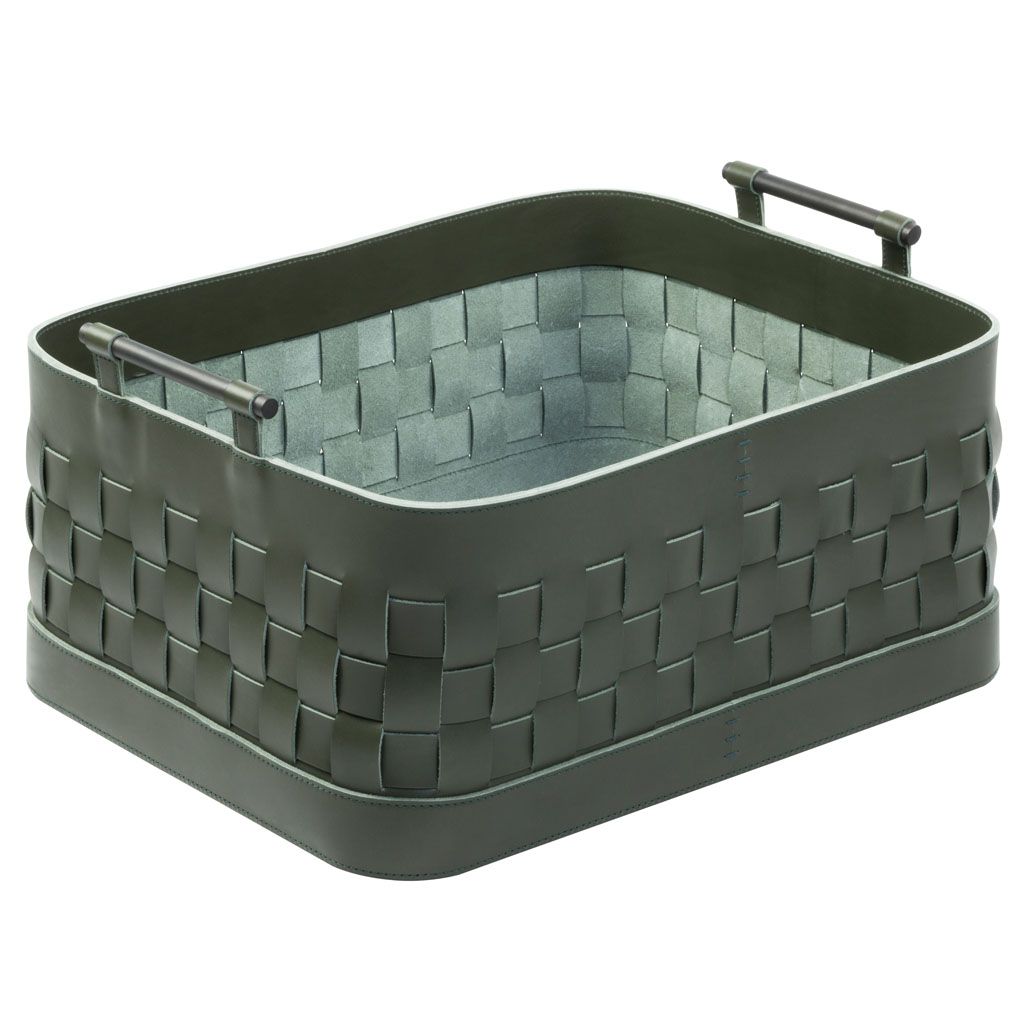 Braided water resistant saddle leather storage basket with brushed bronze handles.
