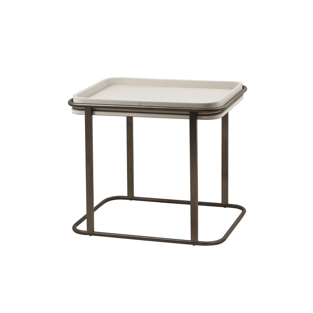 Leather covered wood top and removable tray.