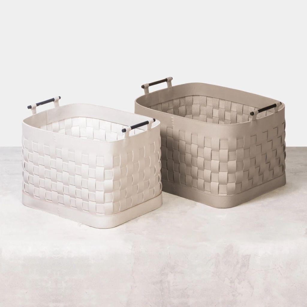 Braided water resistant saddle leather storage basket with brushed bronze handles.