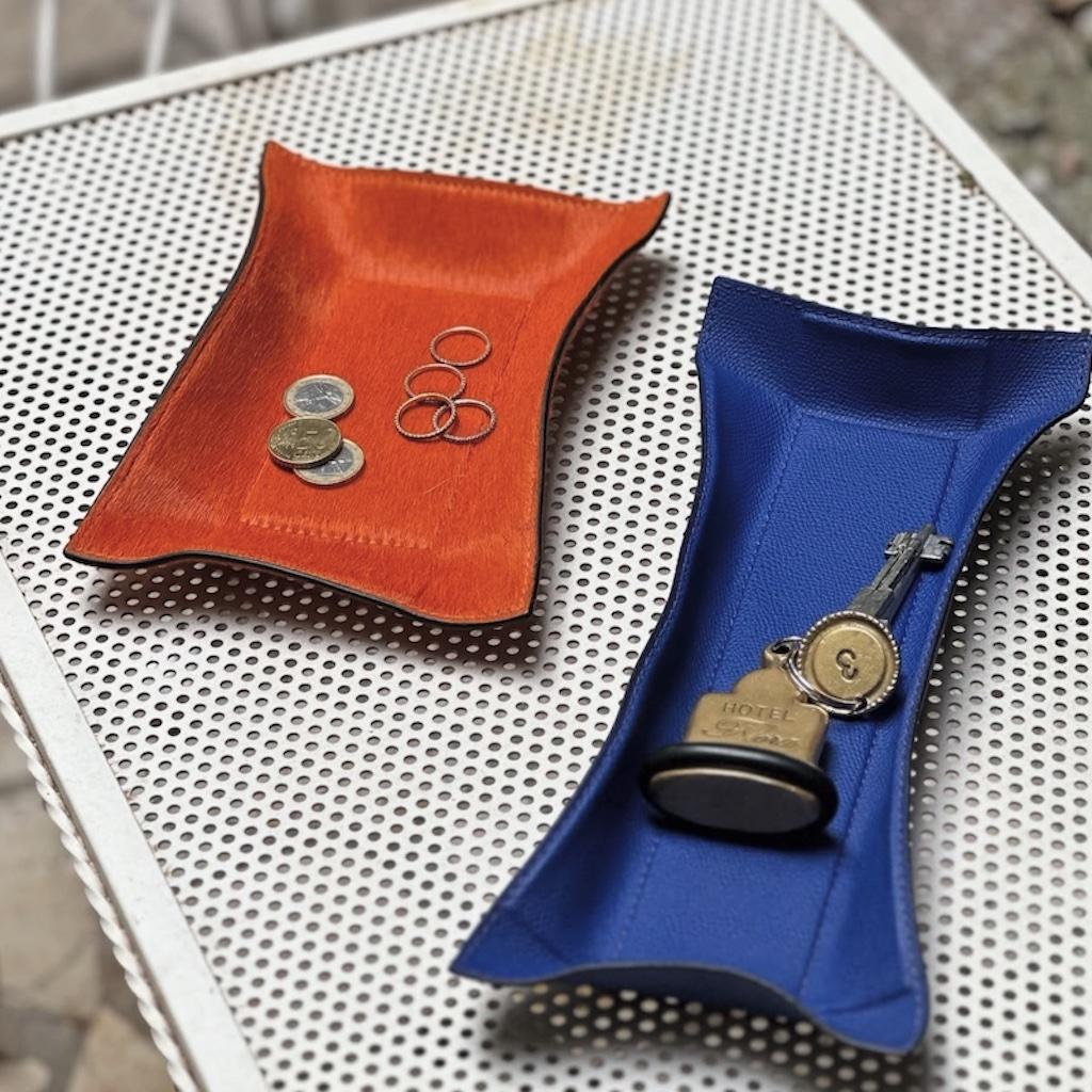 Metal tray covered in handcrafted leather with bendable sides.