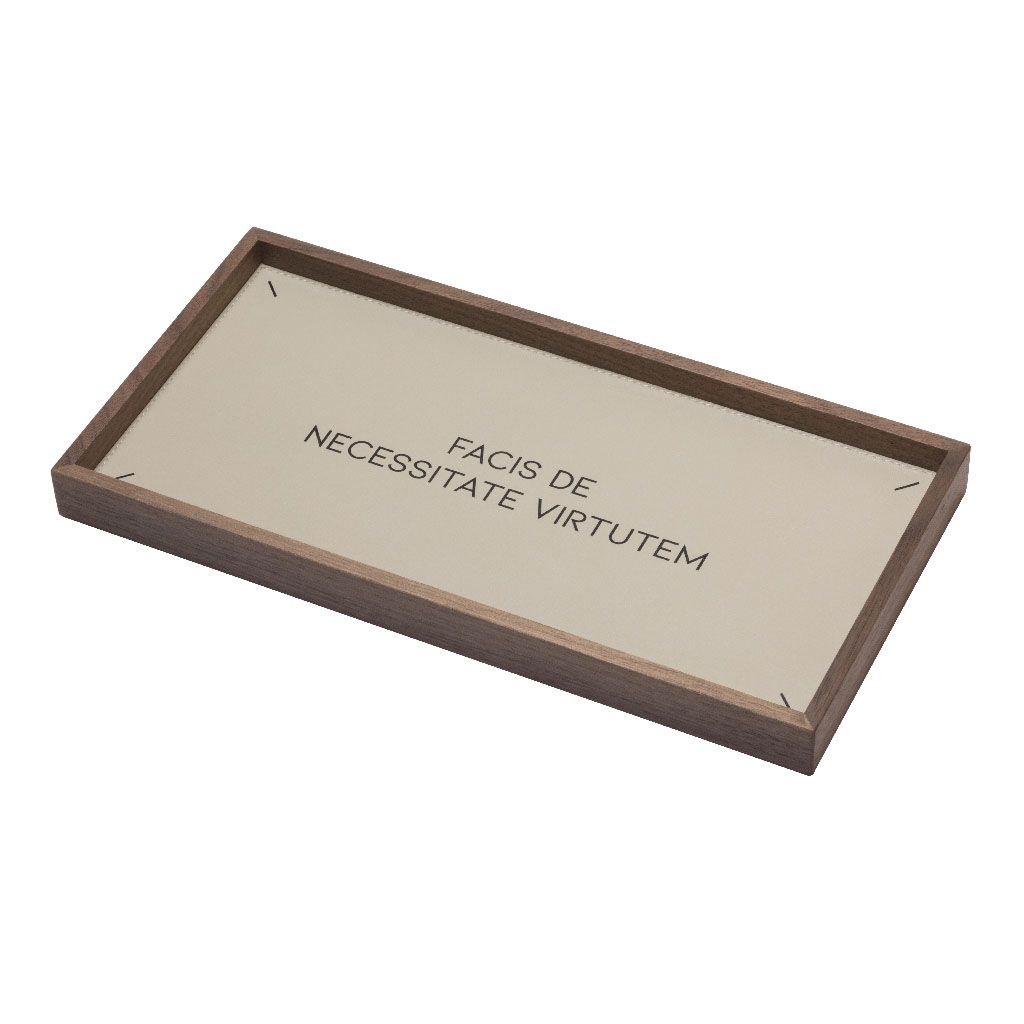 Showcasing ancient mottos taken from the latin tradition, the Heritage collection features walnut and wenge wood valet trays with printed leather lining.