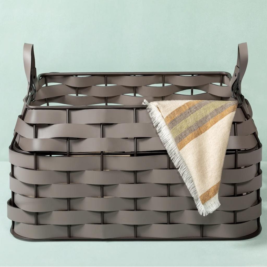 The Nassa collection is the perfect synergy of style and utility, redefining living spaces with its sophisticated allure. The framework of this series of storage baskets boasts a dark-stained aluminum structure and vibrant Tecnocuoio weaving, combining durability with contemporary elegance. This series presents more essential forms, free from superfluous curves, for a look that is pure, balanced, and timeless. Ideal for laundry, towels, magazines or everyday objects. Fit for both indoor and outdoor use. Non-slip waterproof rubber
