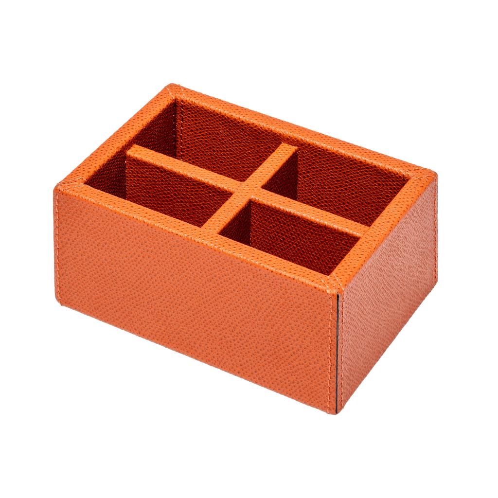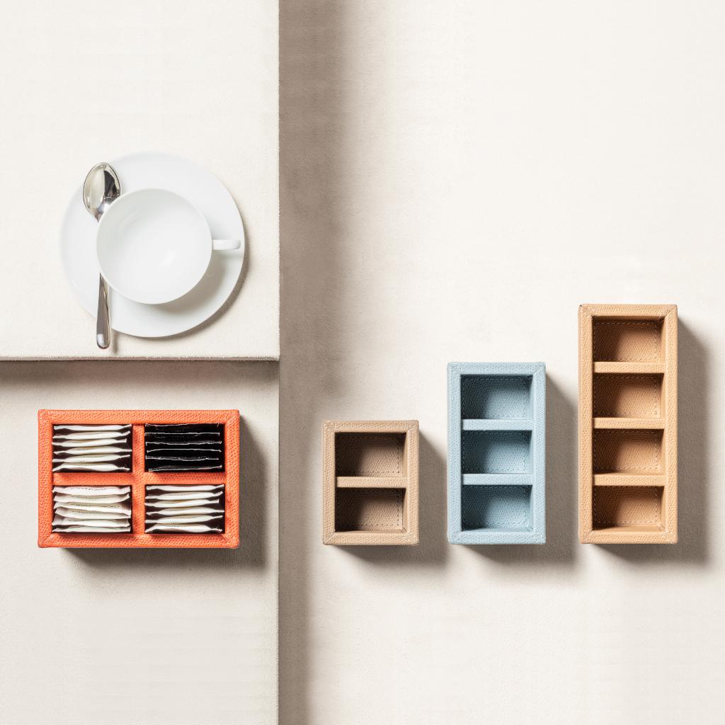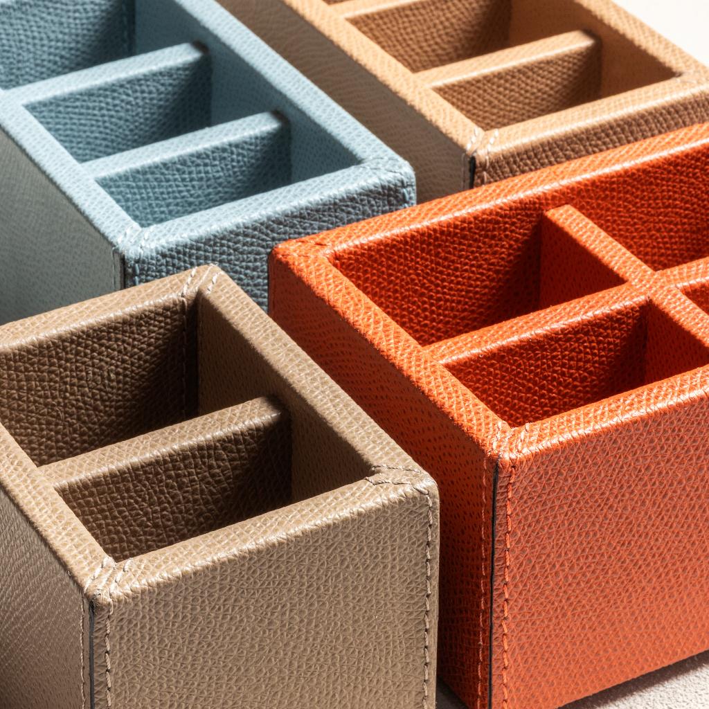 Wooden structures wrapped in leather are organized with precise dividers shaping two, three, or four compartments.
