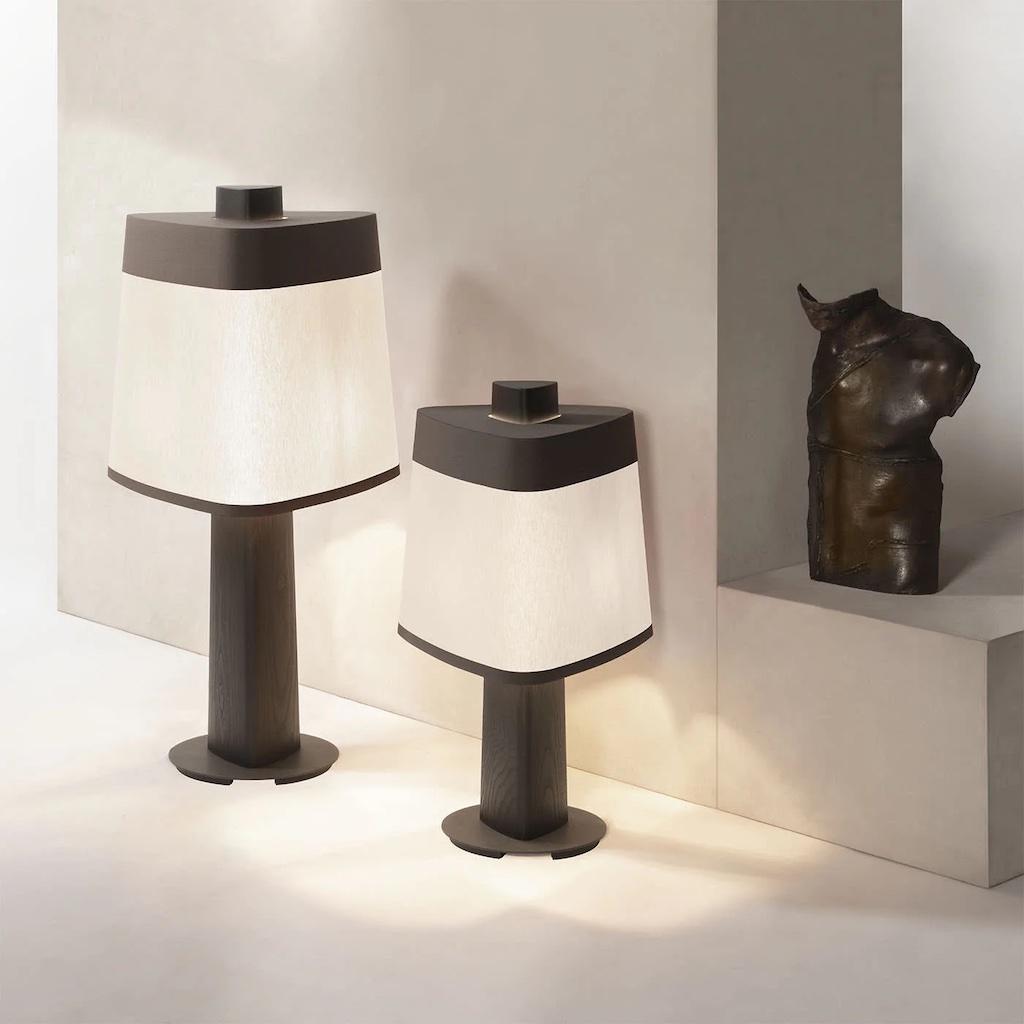 Materials: wood stem (the wood finish can be either dark-stained Canaletto walnut or wenge') and burnished bronze base. Provided with a fine cotton white lampshade.