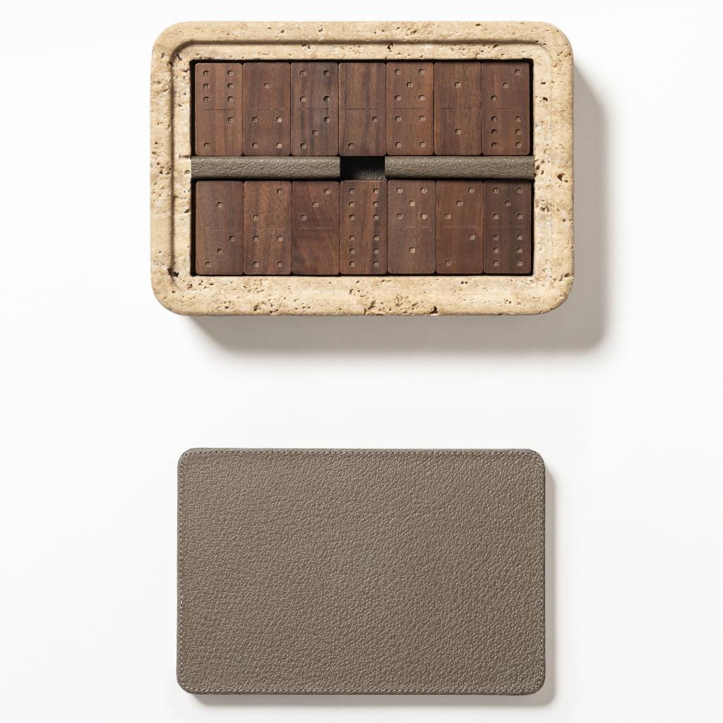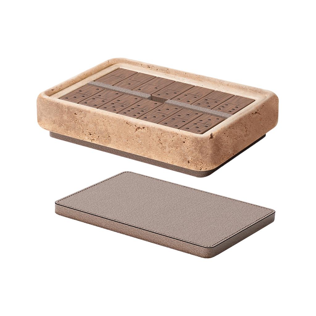 The Rodi domino holder is conceived as a composed creation, defined by balance, material depth, and precise proportion. Its body is carved from a solid block of colored travertine, where essential geometry is softened by measured volumes that allow the stone’s natural character to emerge. A removable leather-covered lid is echoed by a leather-covered fixed base beneath, forming a symmetrical presence when closed and reinforcinga sense of visual continuity. Inside, the piece houses a refined set of walnut wood dominoes, finished with laser-engraved details that speak to accuracy and care. Rodi frames the ritual of play through a restrained dialogue between stone, leather, and wood, resolved with quiet precision.