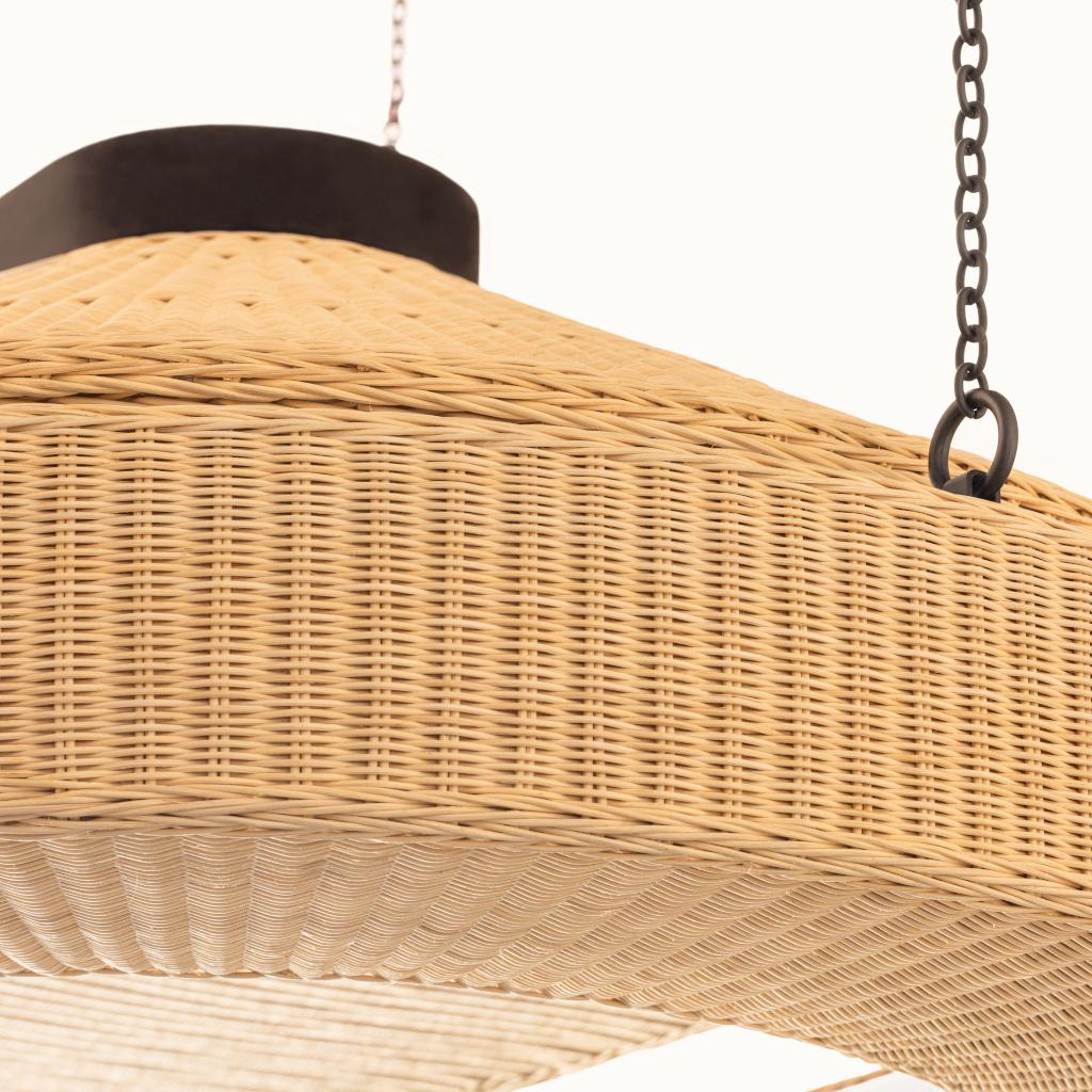 Featuring an essential conic shape, the massive volume of the Orion chandelier is rendered weightless by the use of the finest, meticulously handwoven rattan.