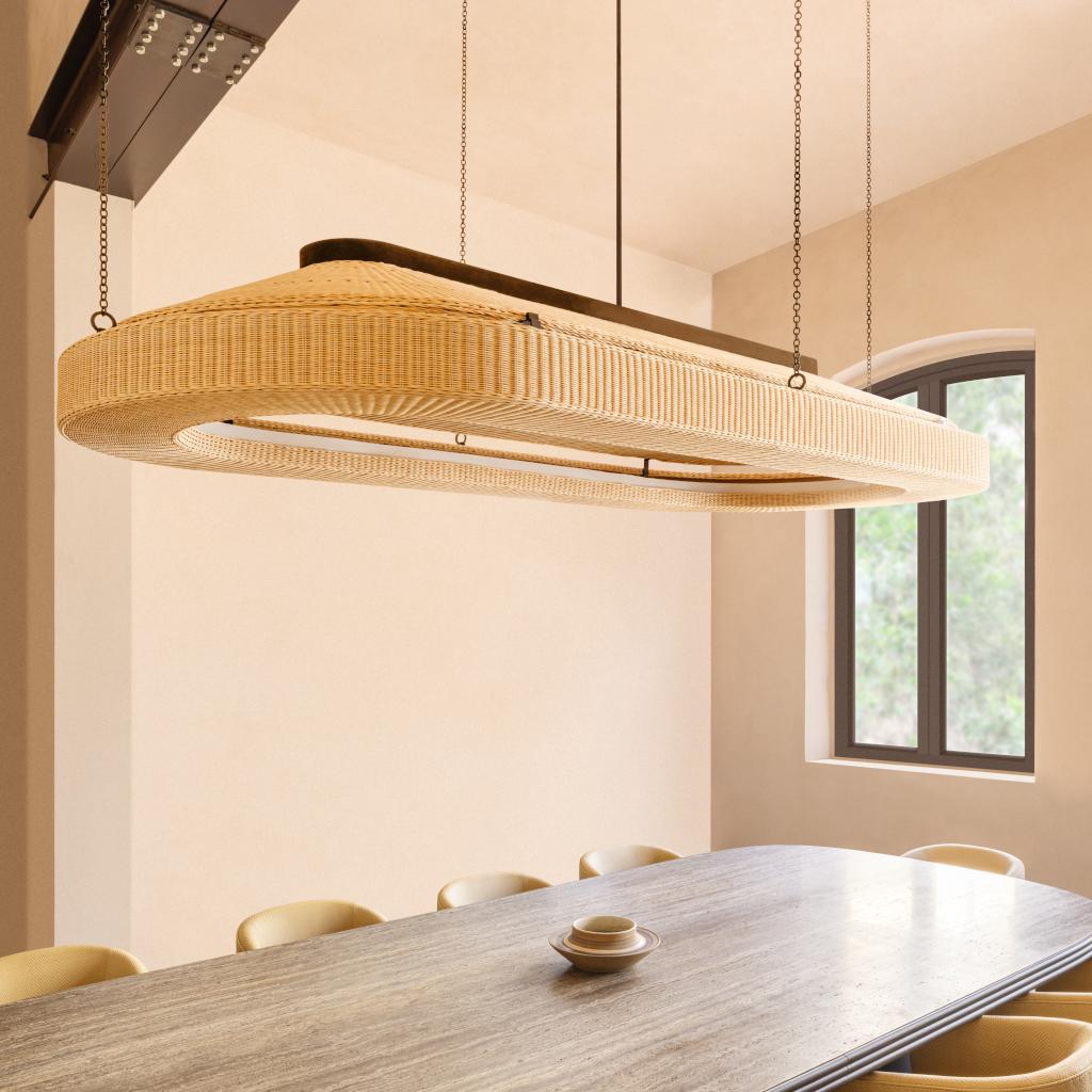 Woven rattan with burnished brushed bronze suspension chains.