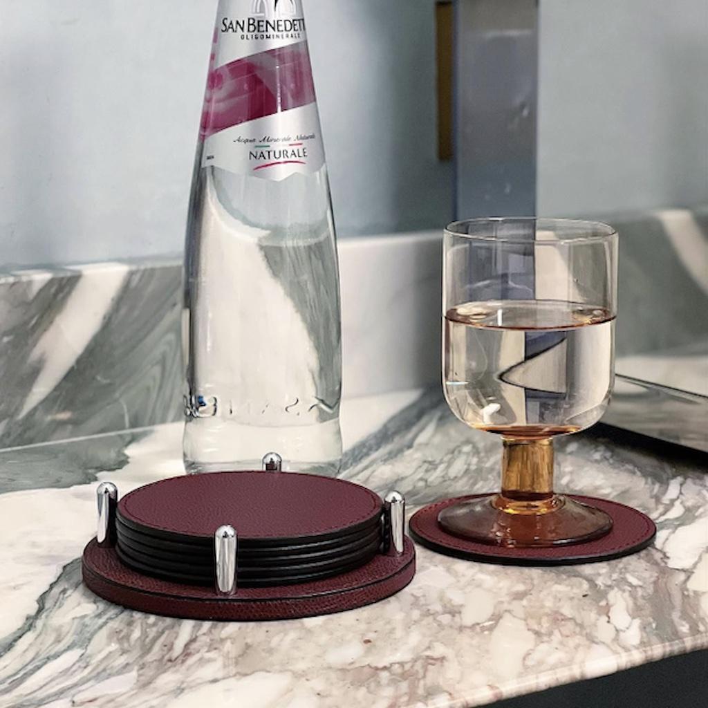 Coasters made entirely in leather, semi-flexible and waterproof.