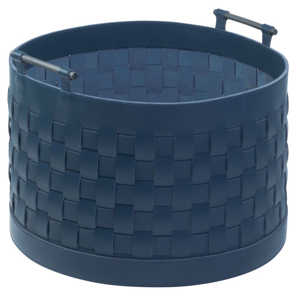 Braided water resistant saddle leather storage basket with brushed bronze handles.