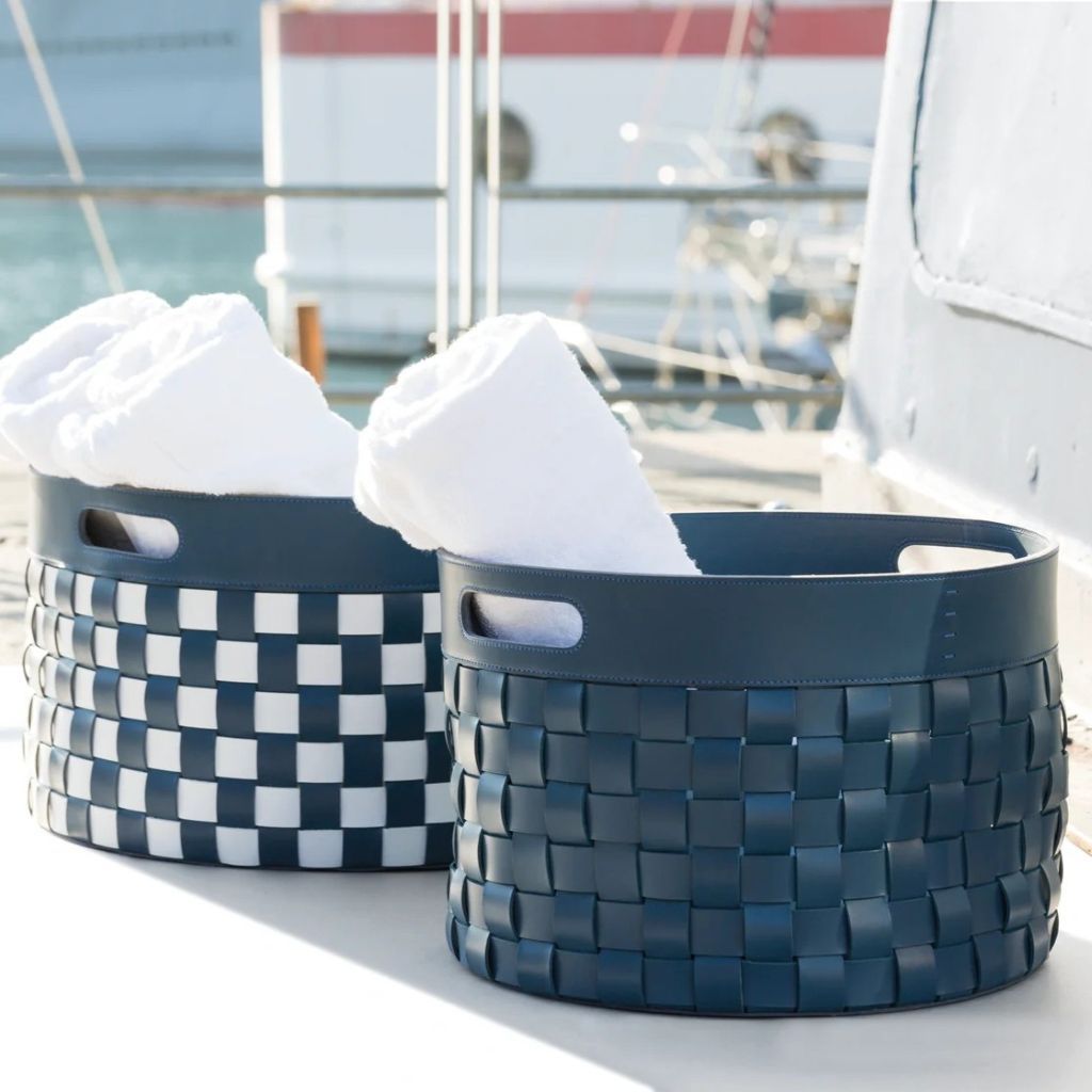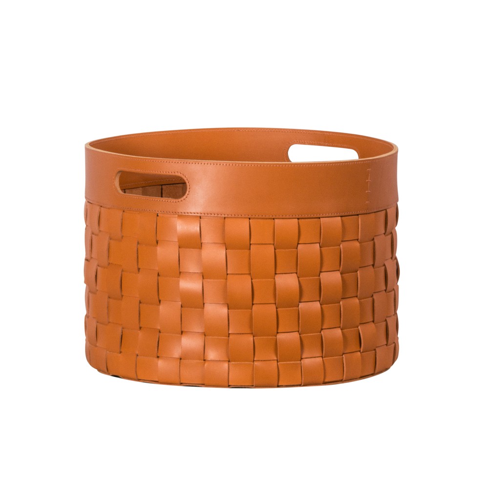 Water resistant woven saddle leather storage basket with handles.