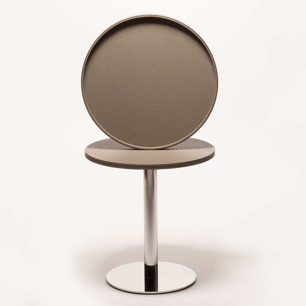 Stainless steel structure with leather covered wood top and removable tray.