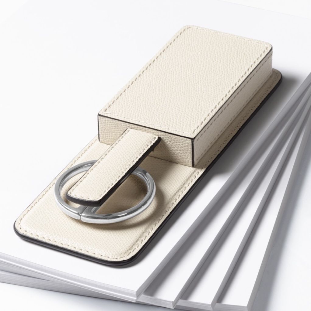 Leather-covered wood structure with two spaces to host scissors and a paperknife.