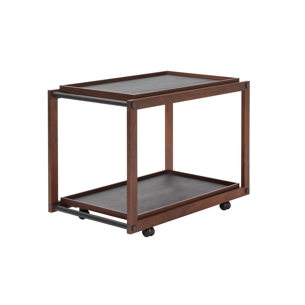 Wood structure available in different finishes featuring fine leather and metal inserts. Provided with two removable trays and omnidirectional wheels.