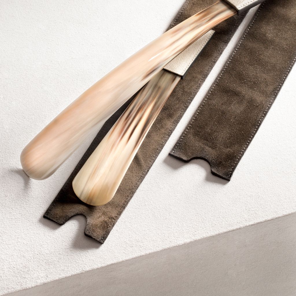 Buffalo antique horn and leather handle. Each horn is different from another.