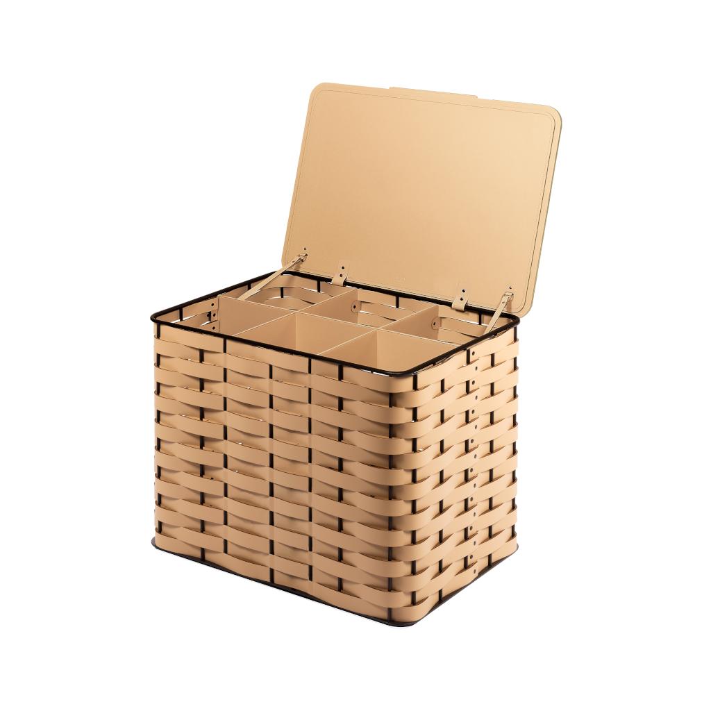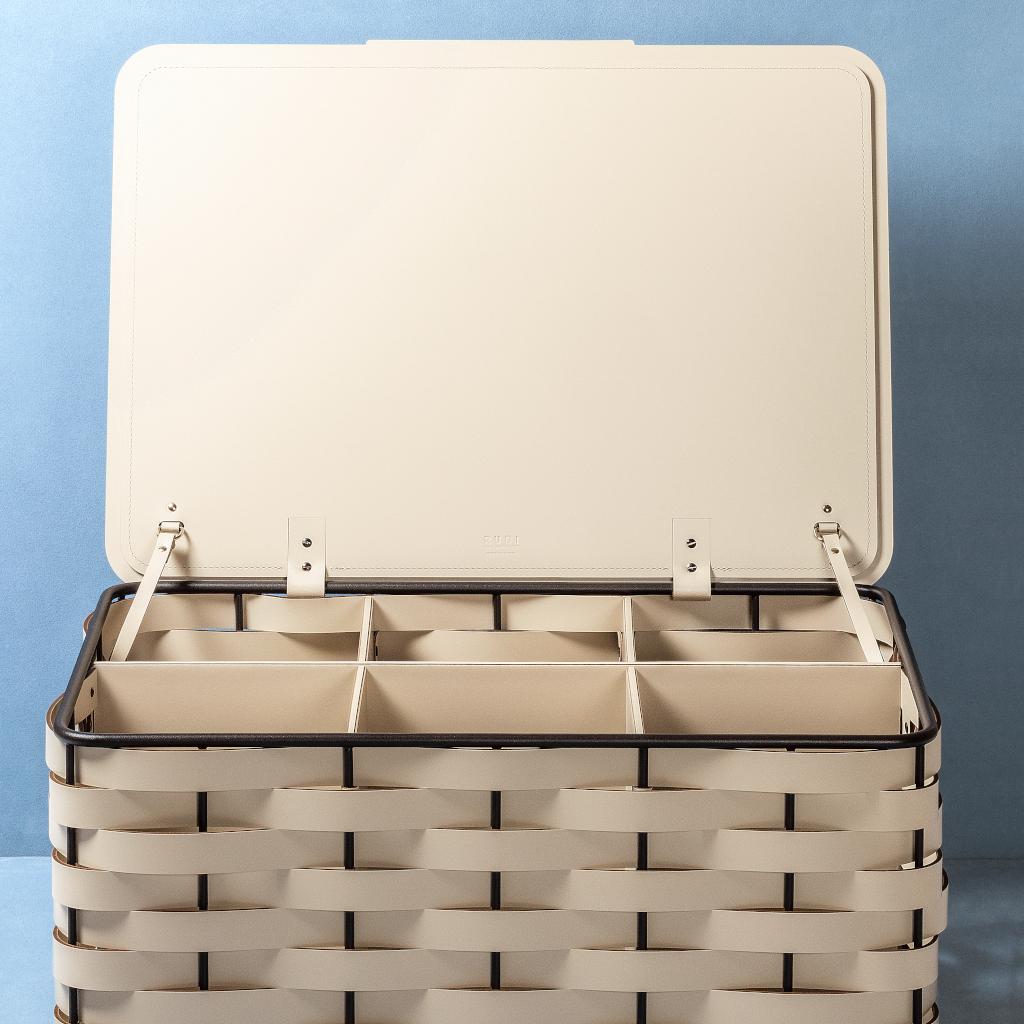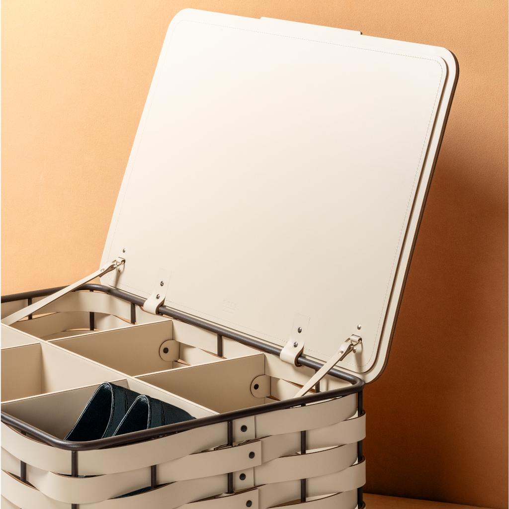 The Nassa trunk expands the collection with a structured, storage-focused solution. Rectangular in form, it features a hinged lid and adapts to different functional needs while maintaining a clean, essential profile. Available with or without six internal dividers designed to organize and store footwear with clarity and precision. Built on a dark-stained aluminum frame with Tecnocuoio weaving, it combines durability, order, and versatility in a refined storage piece suited to both residential and professional spaces.