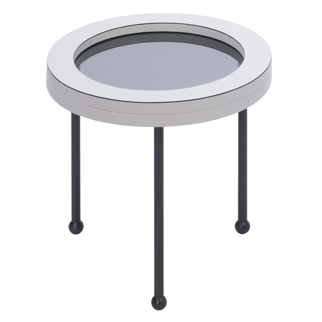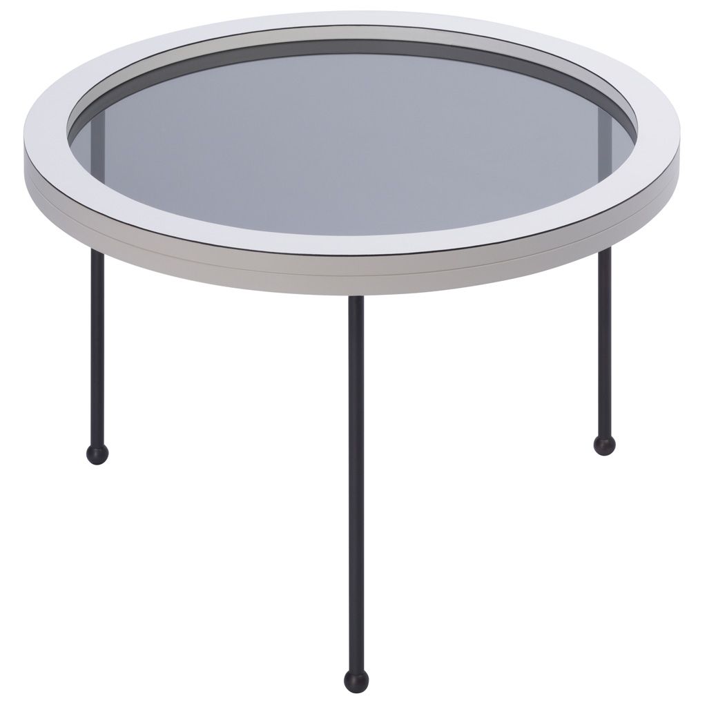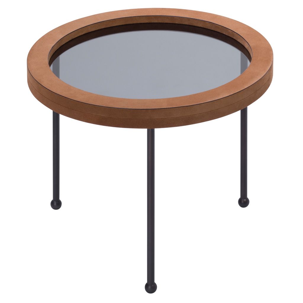 A collection of round nesting tables embedded by bronze legs and smoked glass surfaces, circled by a thick leather edge in a reference to portholes of the greatest Italian Ocean Liner designs of 1950's.