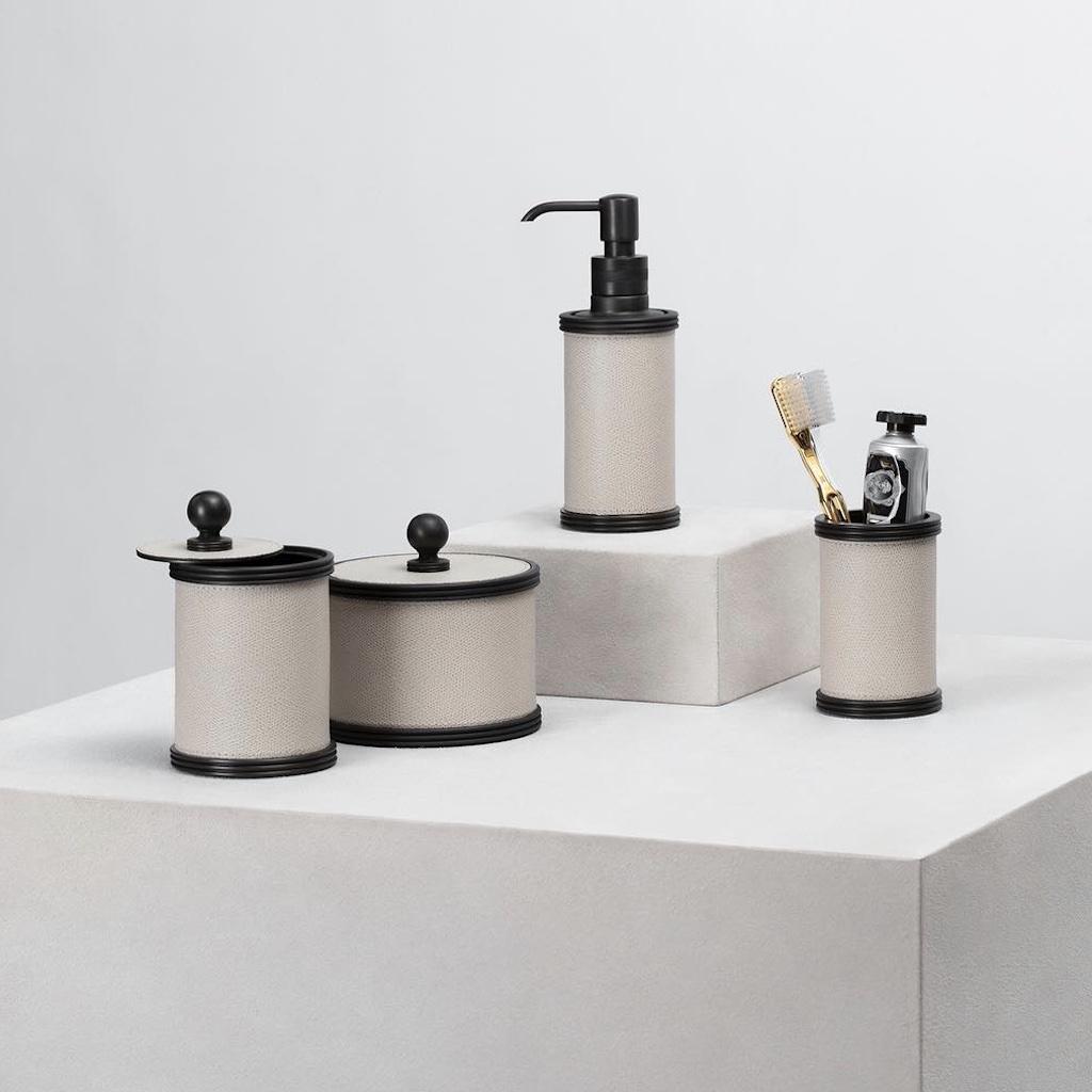 Leather covered solid brass structure with non-slip waterproof rubber base.