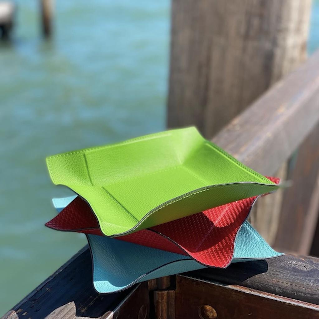 Metal tray covered in handcrafted leather with bendable sides.