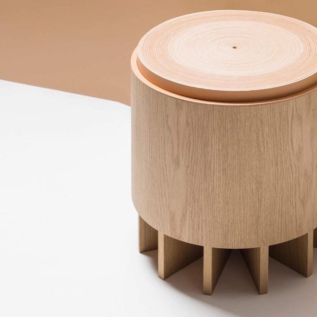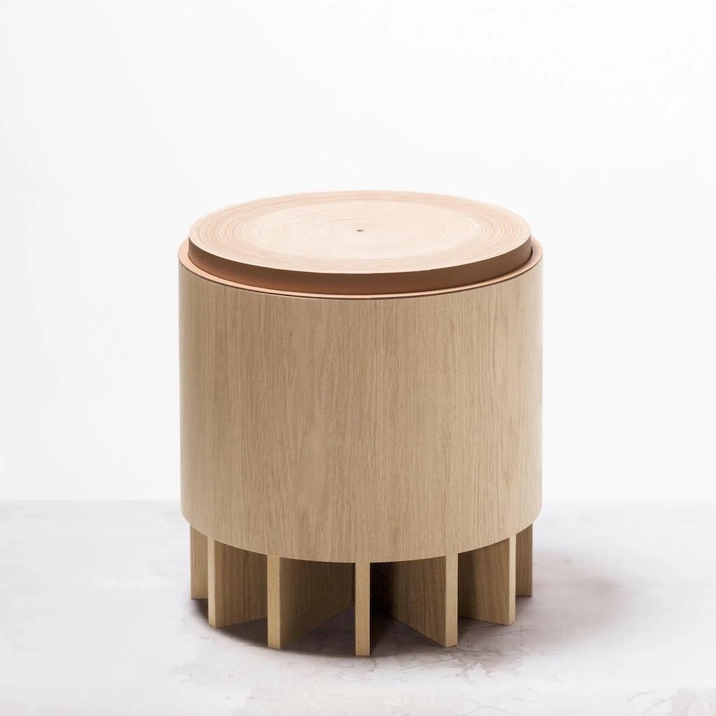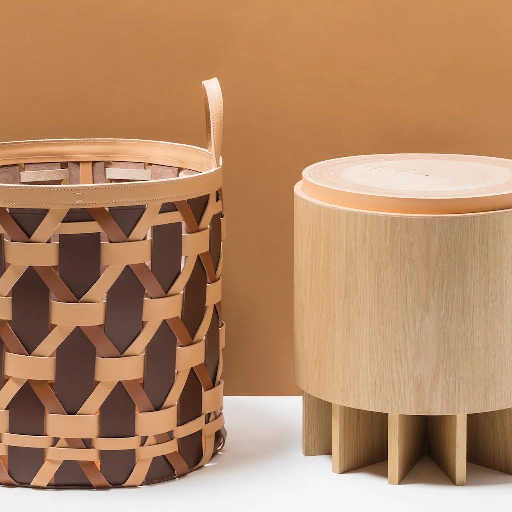 Laminated wood structure boasting a roller saddle leather insert on top.
