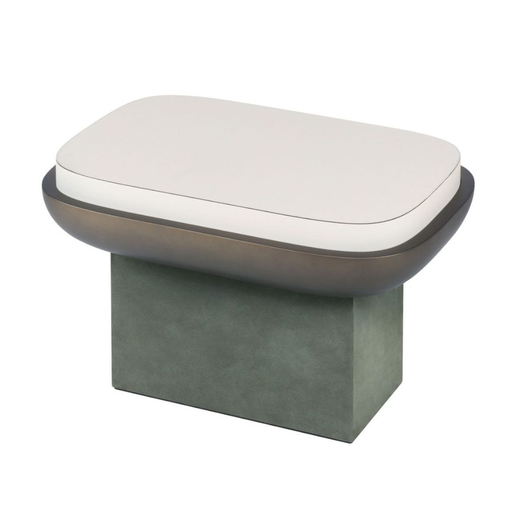 An extended collection of side tables and seats that mix hard and smooth materials such as suede, leather and bronze lacquered wood.