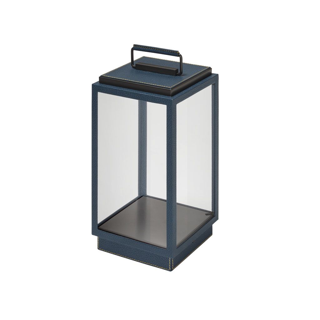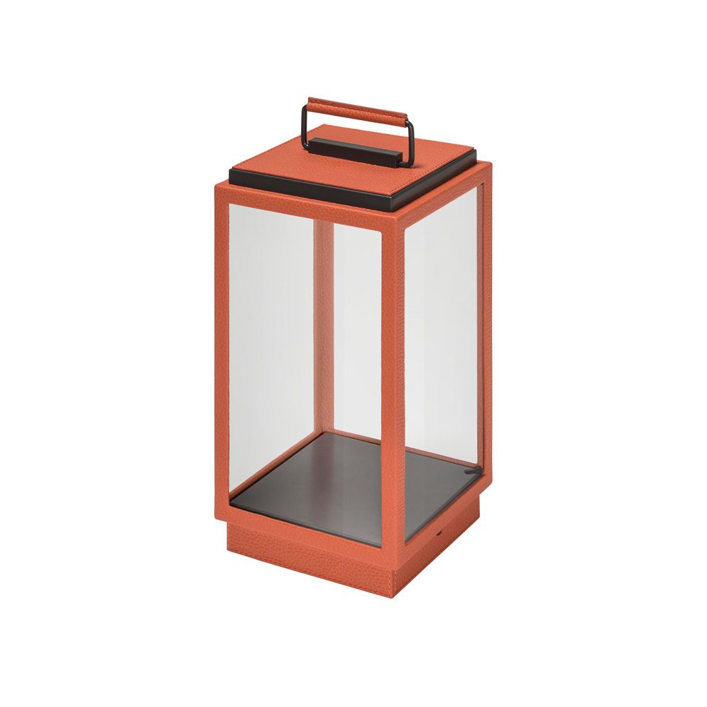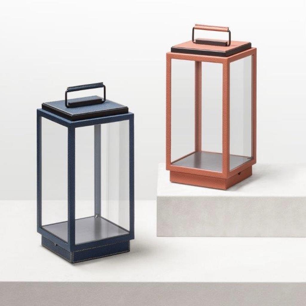 Eclectic leather-covred brass table lamp with clear glass inserts. Due to its minimal and portable light design, this lamp is perfecly fit for any kind of environment, looking brilliant both indoors and outdoors. Supplied with rechargeable Li-ion battery able to last uo to 5 hours after full recharge (2 hours).