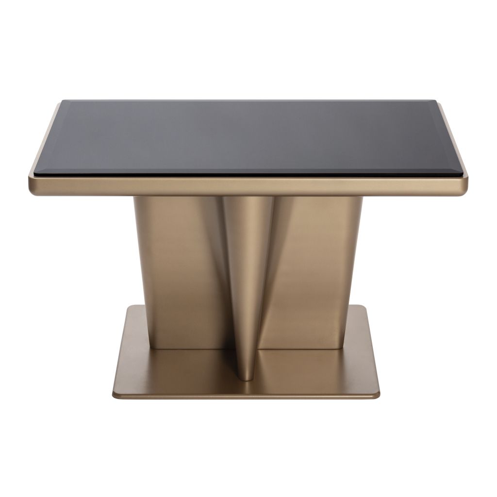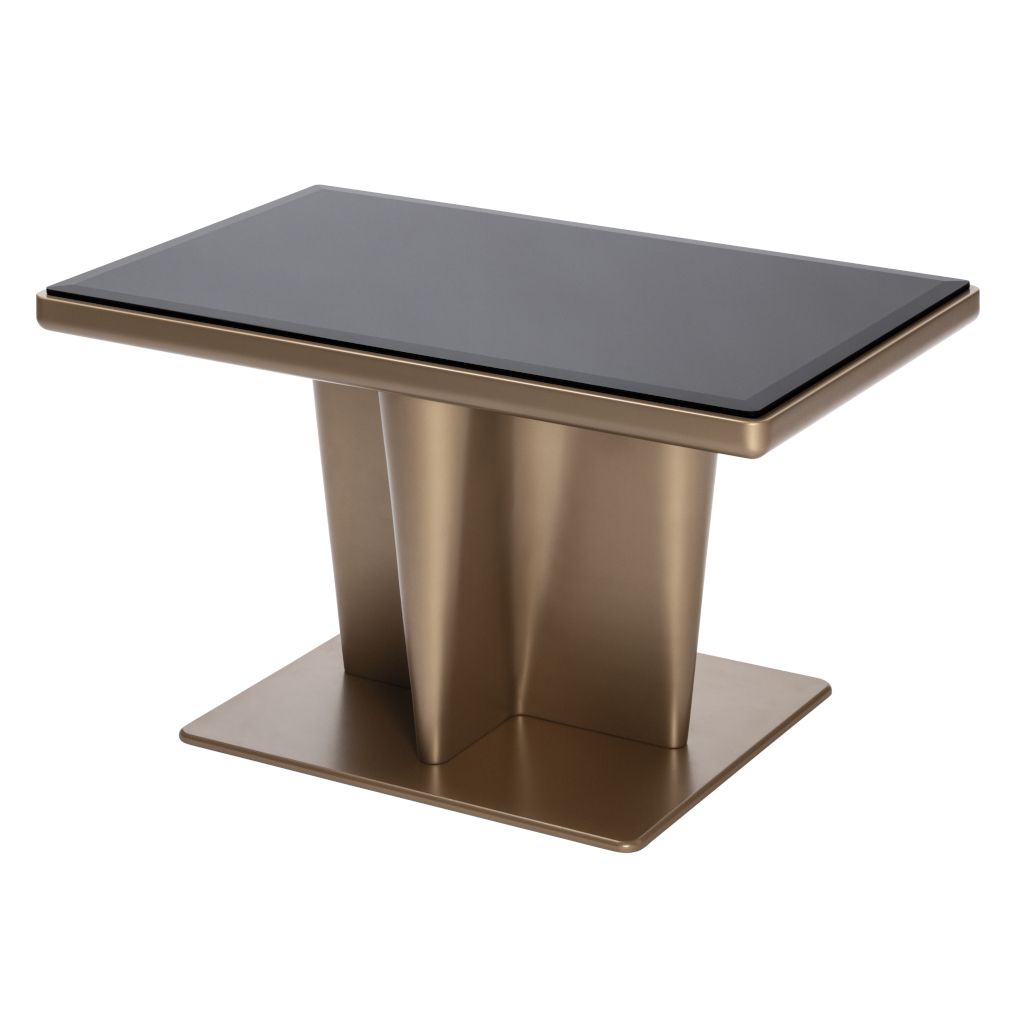 Materials: raw bronze or dark bronze-lacquered wood structure with bronze-colored glass top insert.