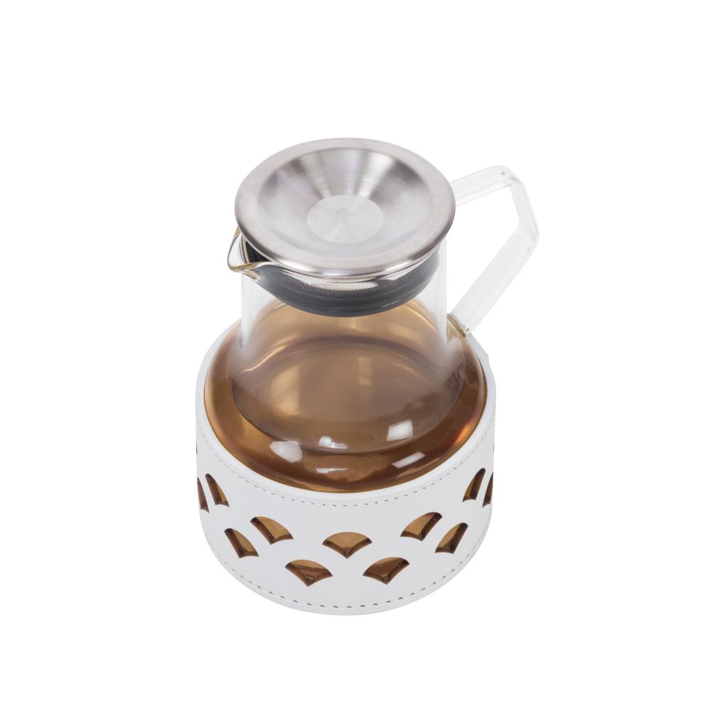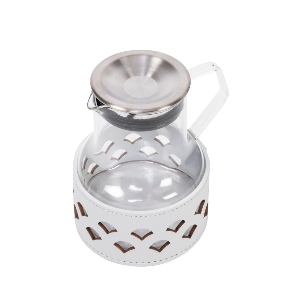 Transparent borosilicate glass partially dressed in finest regenerated leather with water-resistant and UV-resistant finish. Featuring a stainless steel lid with built-in filter and heat-resistant glass body, it can
