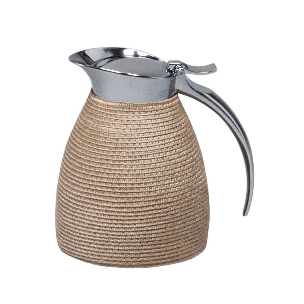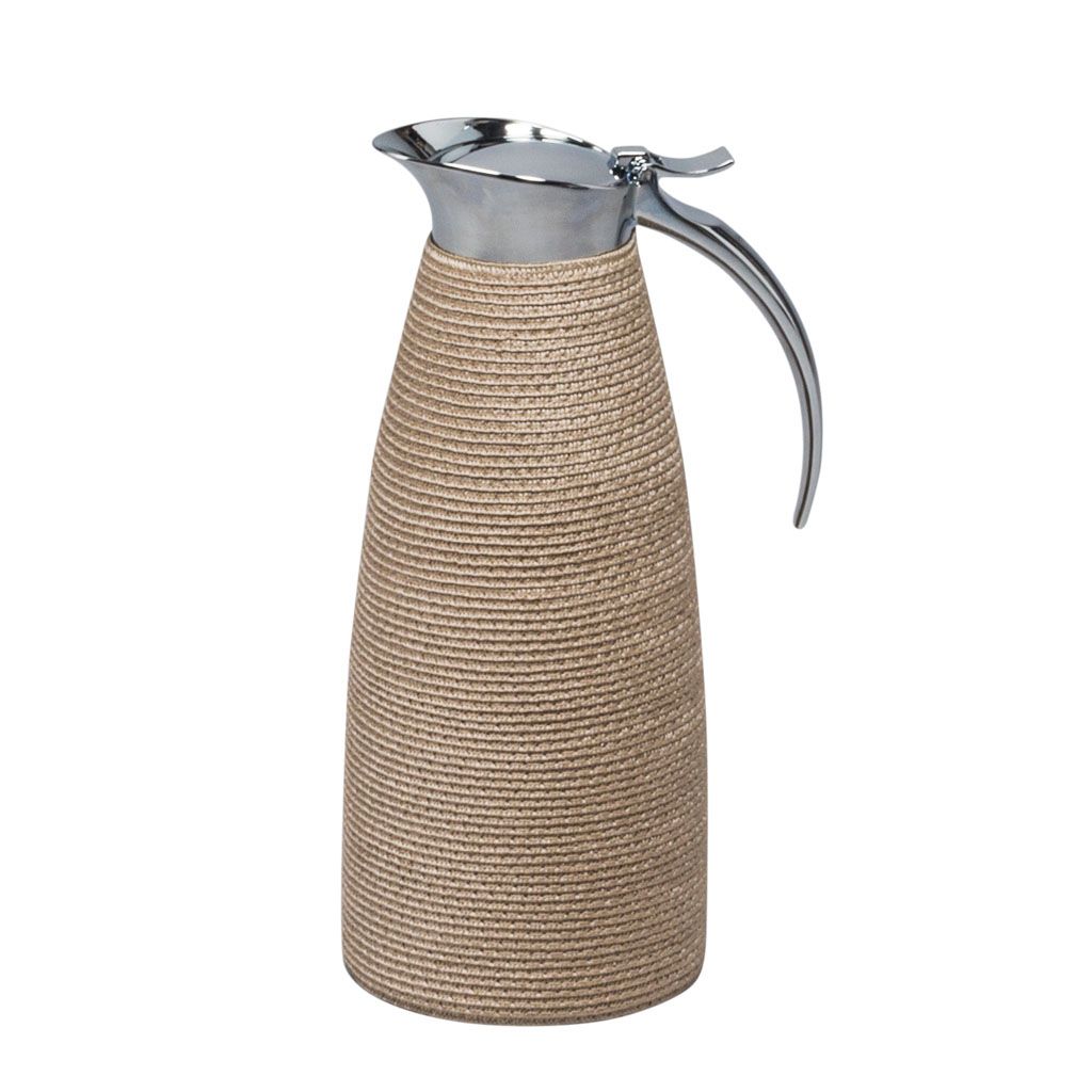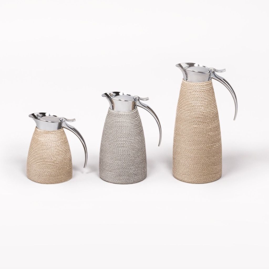 Partially techstraw covered insulated stainless steel carafes with chrome-plated finish.