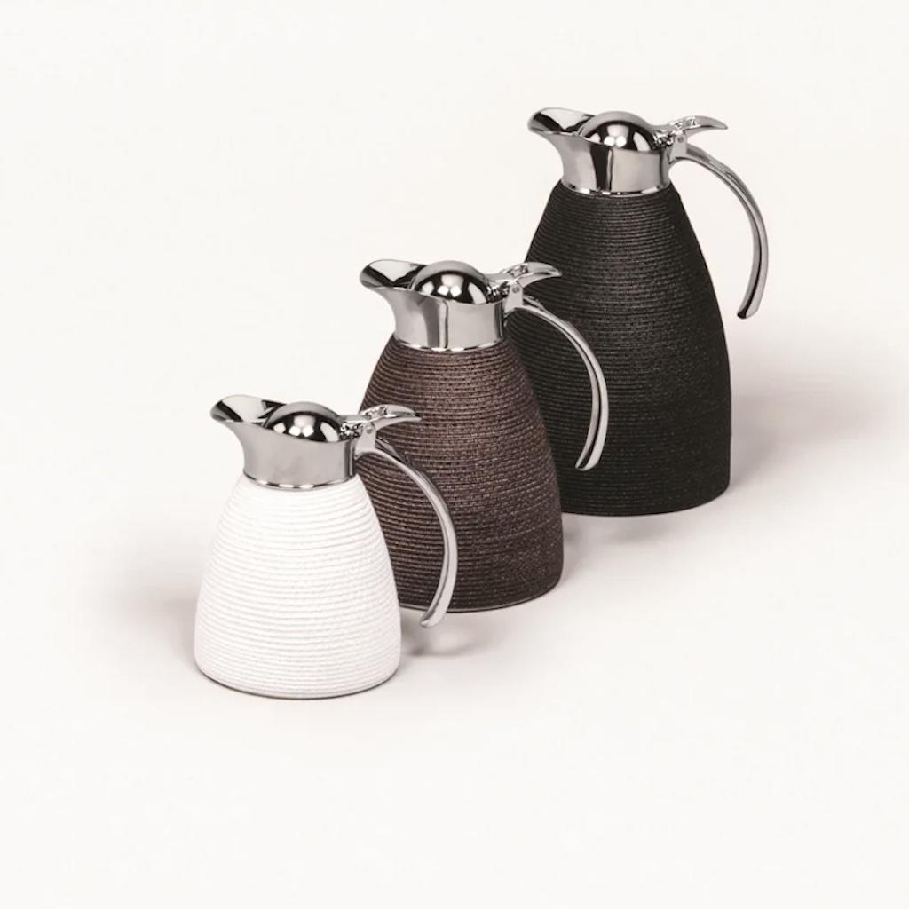 Partially techstraw covered insulated stainless steel carafes with chrome-plated finish.