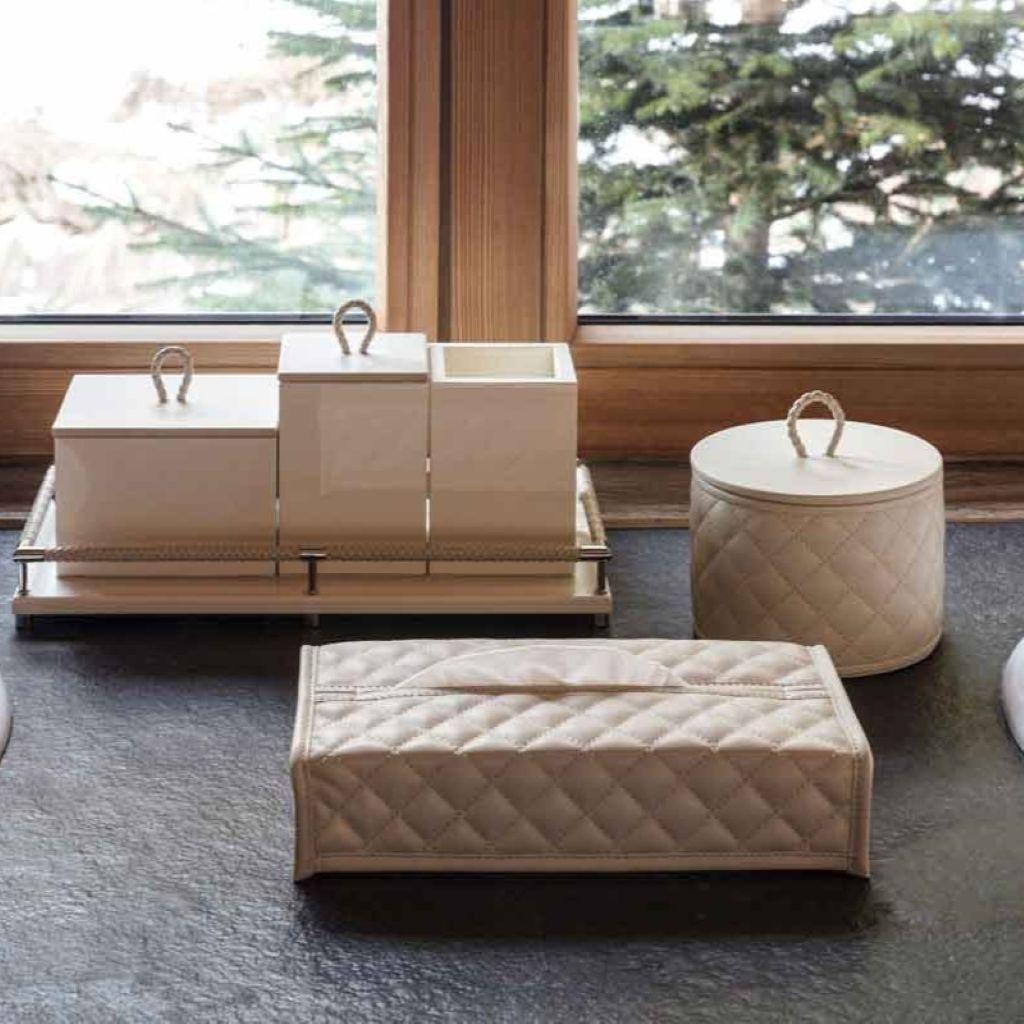 Vanity tray with two trinket boxes and one container, lacquered wood base and braided leather railing, chrome or gold details.