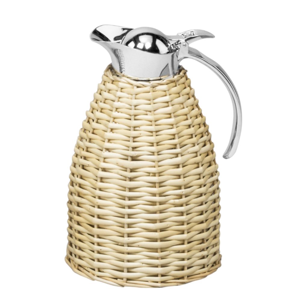 Partially willow covered insulated stainless steel carafes with chrome-plated finish.