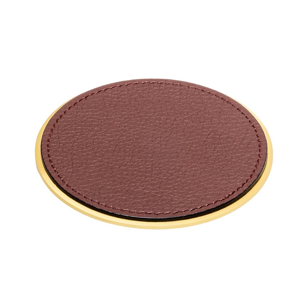 A round metal plate is enclosed between two leather discs, giving weight and a sleek, tactile feel.