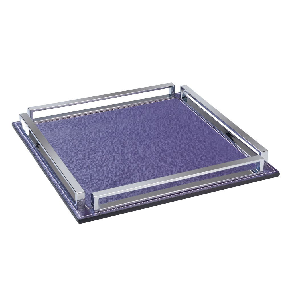Handcrafted wood tray covered in leather, border in chrome metal finishing.