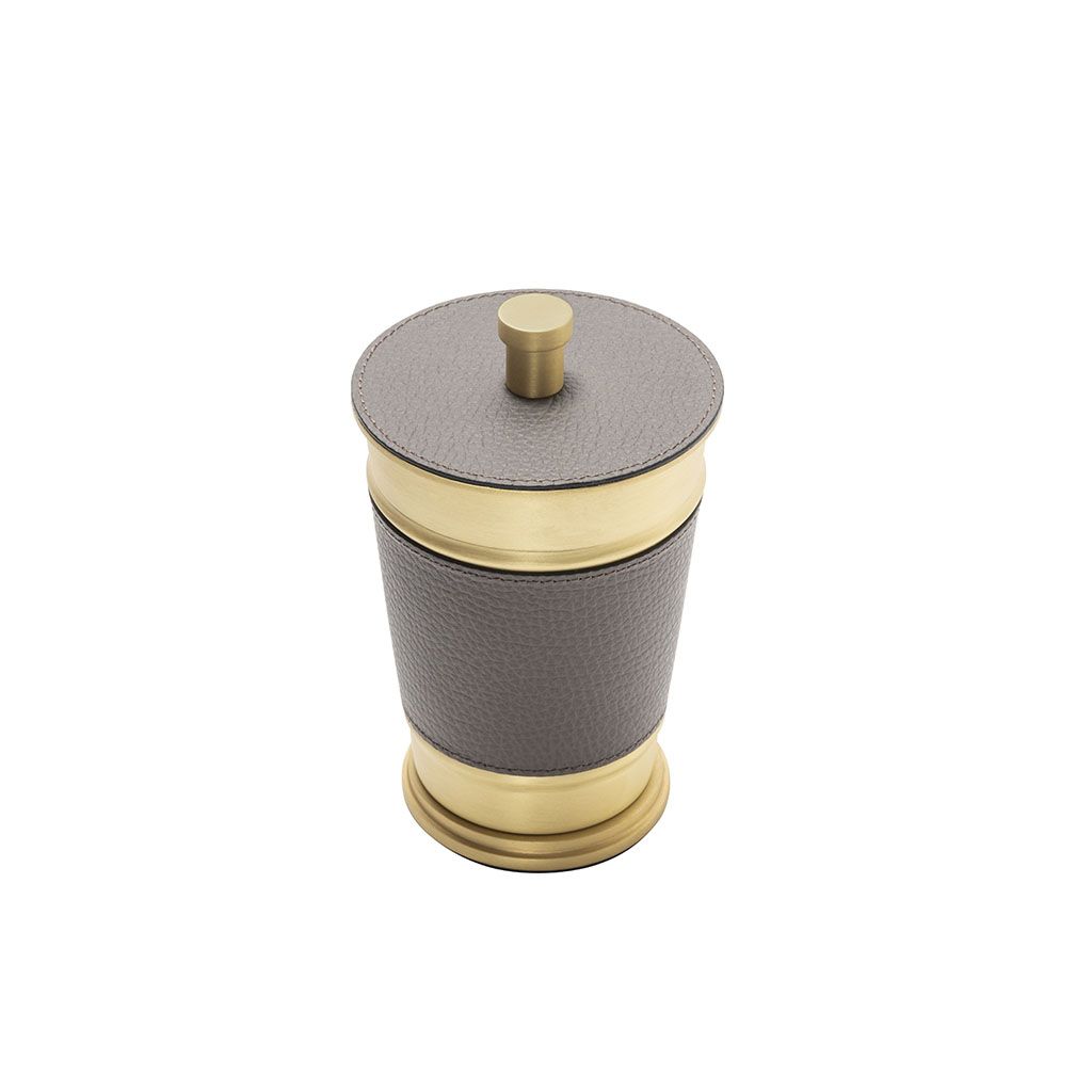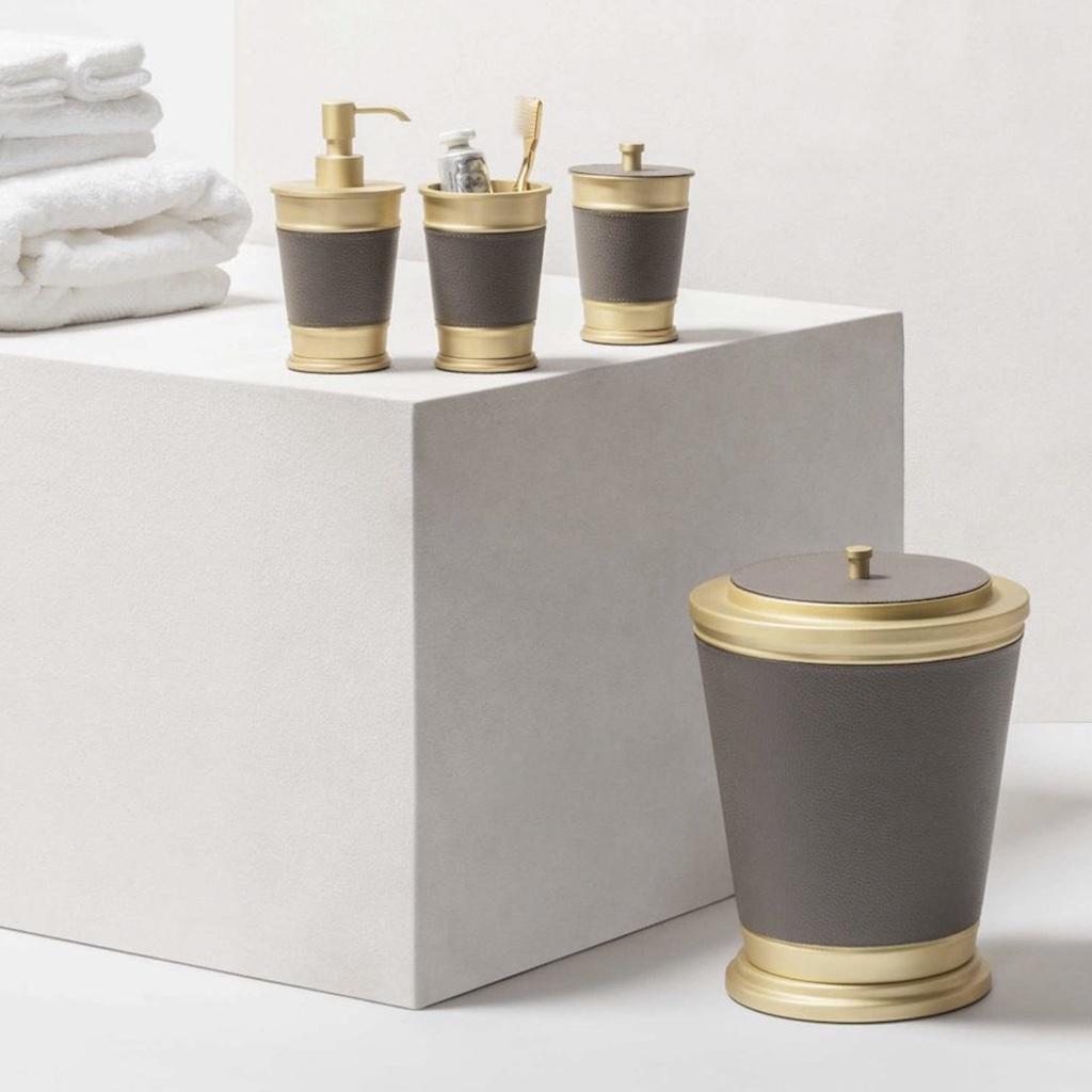 The pieces belonging to this bathroom set boast a characterizing inverted truncated cone metal structure with fine leather inserts.