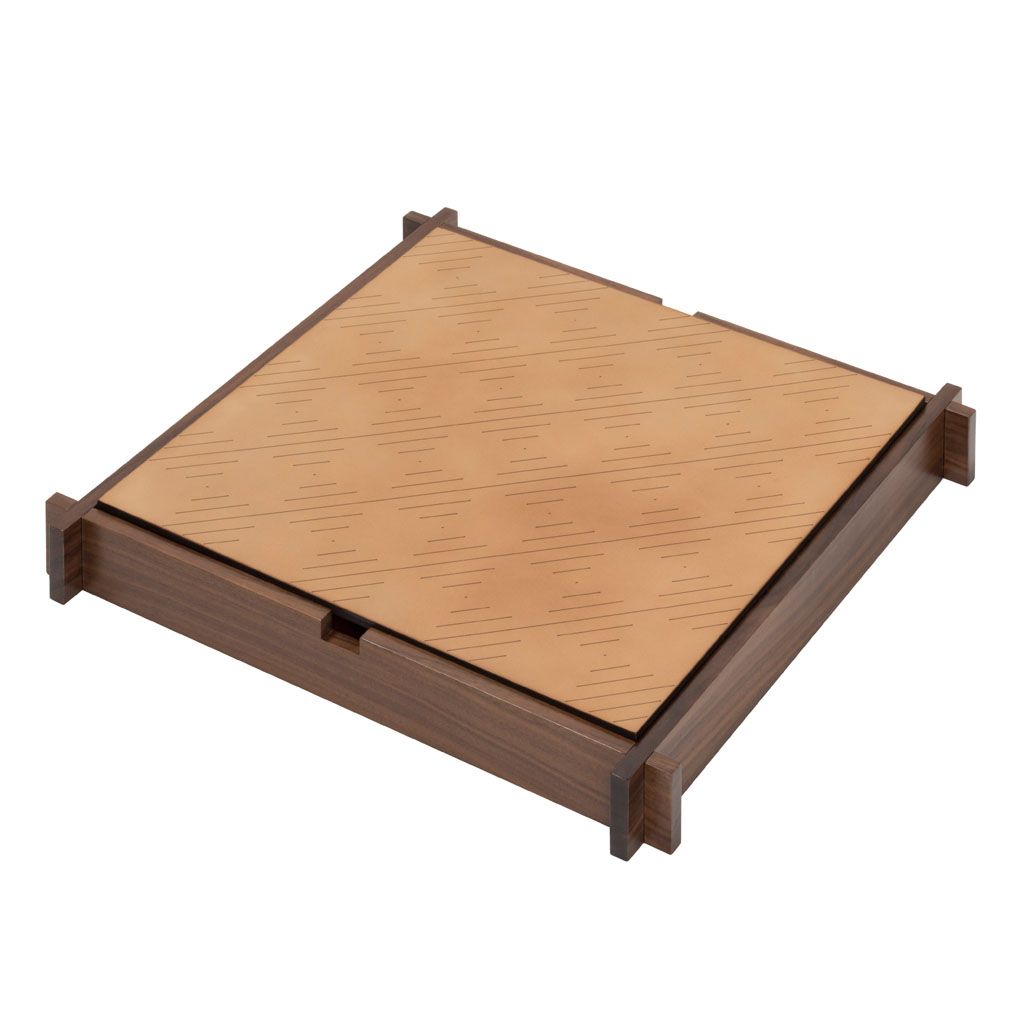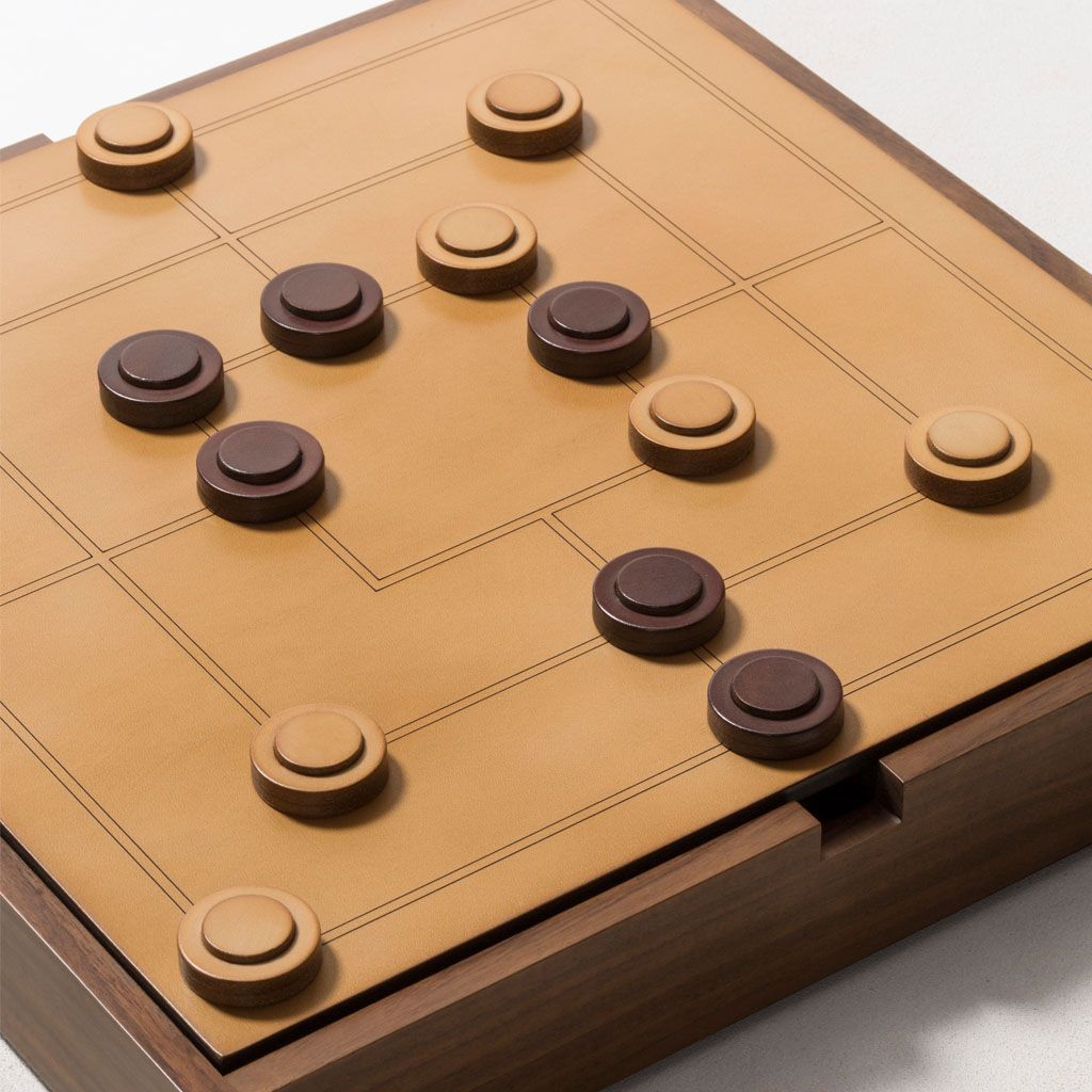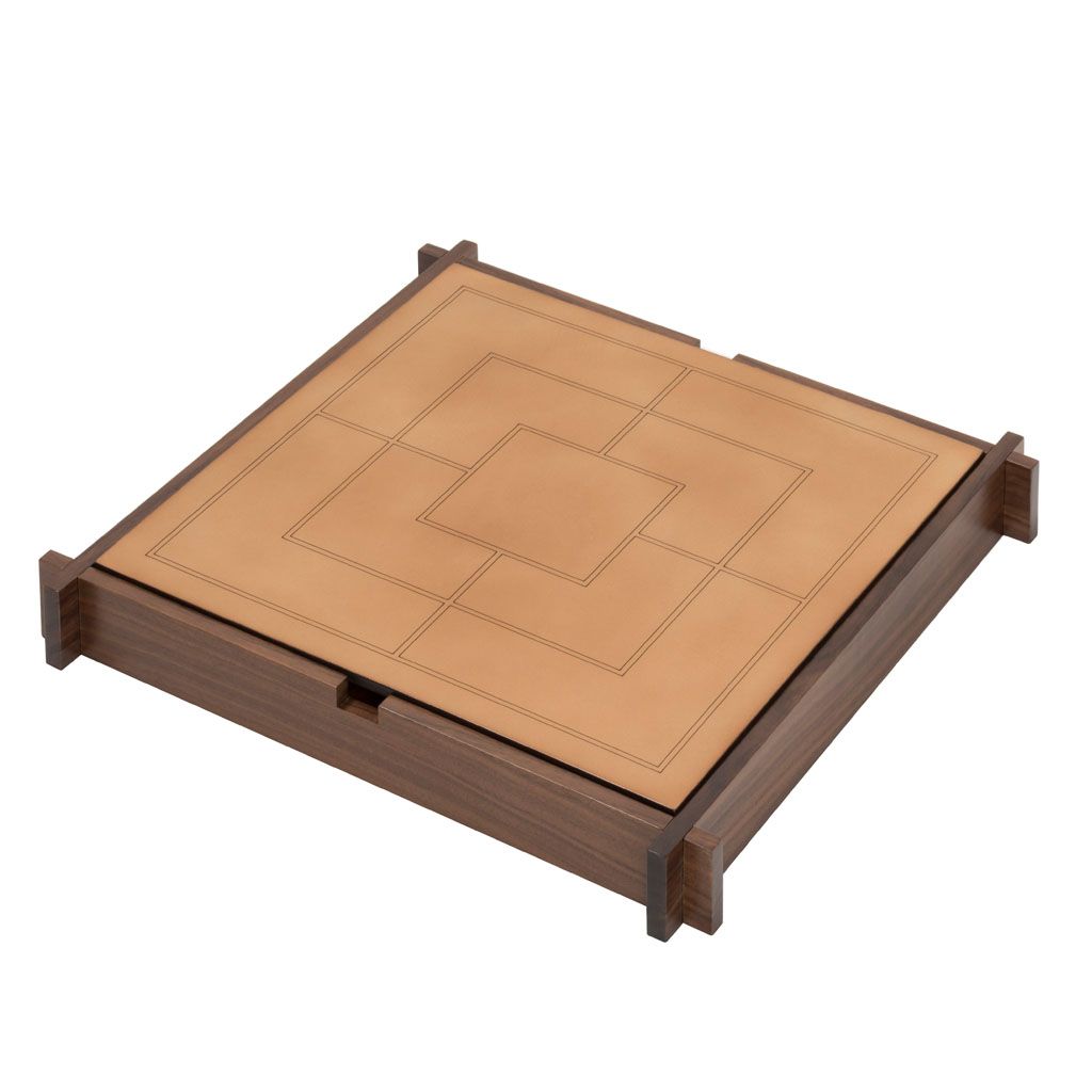 Walnut wood structure with sole leather cover featuring an engraved chess and draughts field on one side and a muehle field on the other.