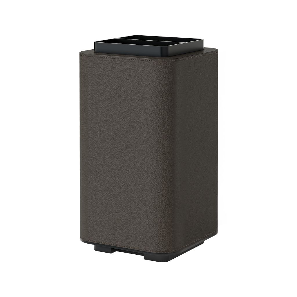 A burnished brushed bronze structure clad in a thick layer of leather-covered wood defines this umbrella stand, complete with two removable bronze bases at different heights, one for small umbrellas, the other for regular ones.