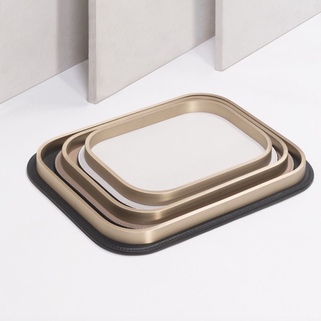 Leather covered metal base with metal frame, availabler in 3 finishes: Chrome, Brass, Bronze.