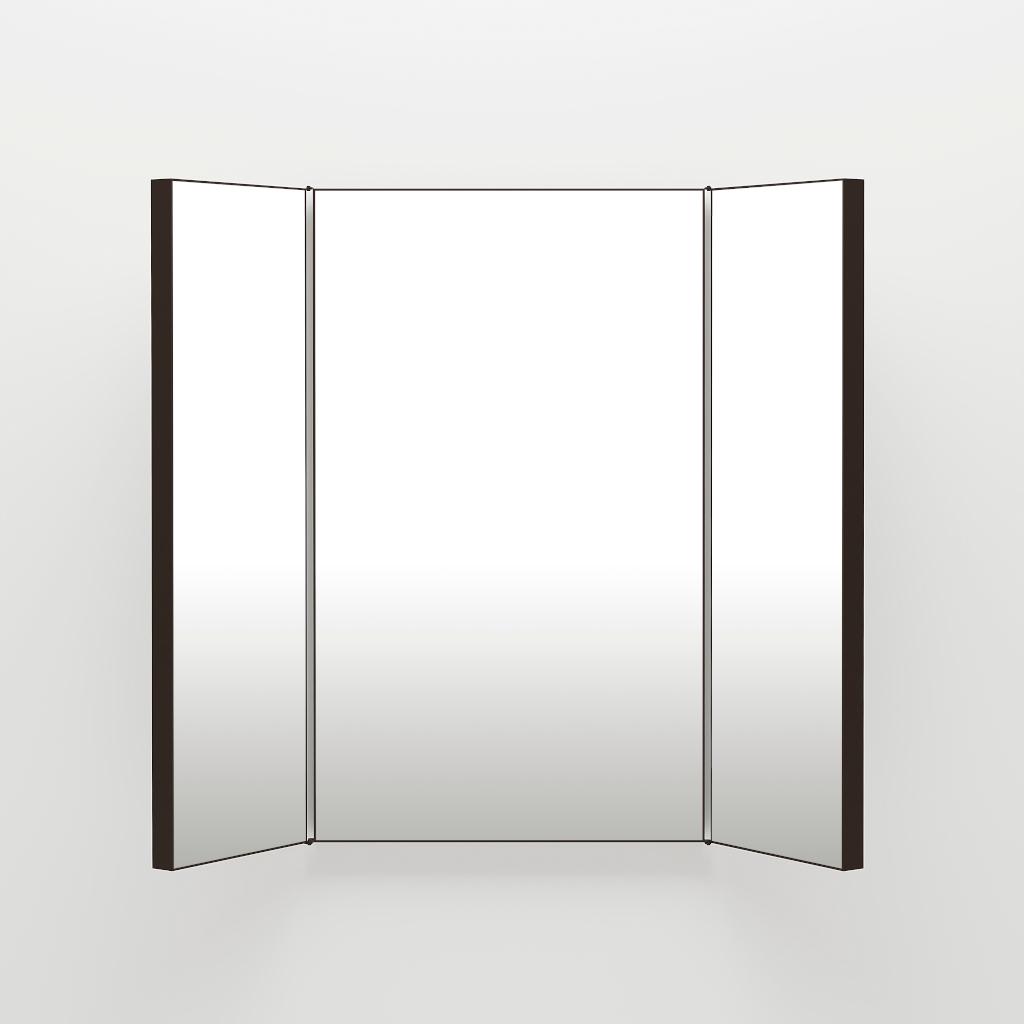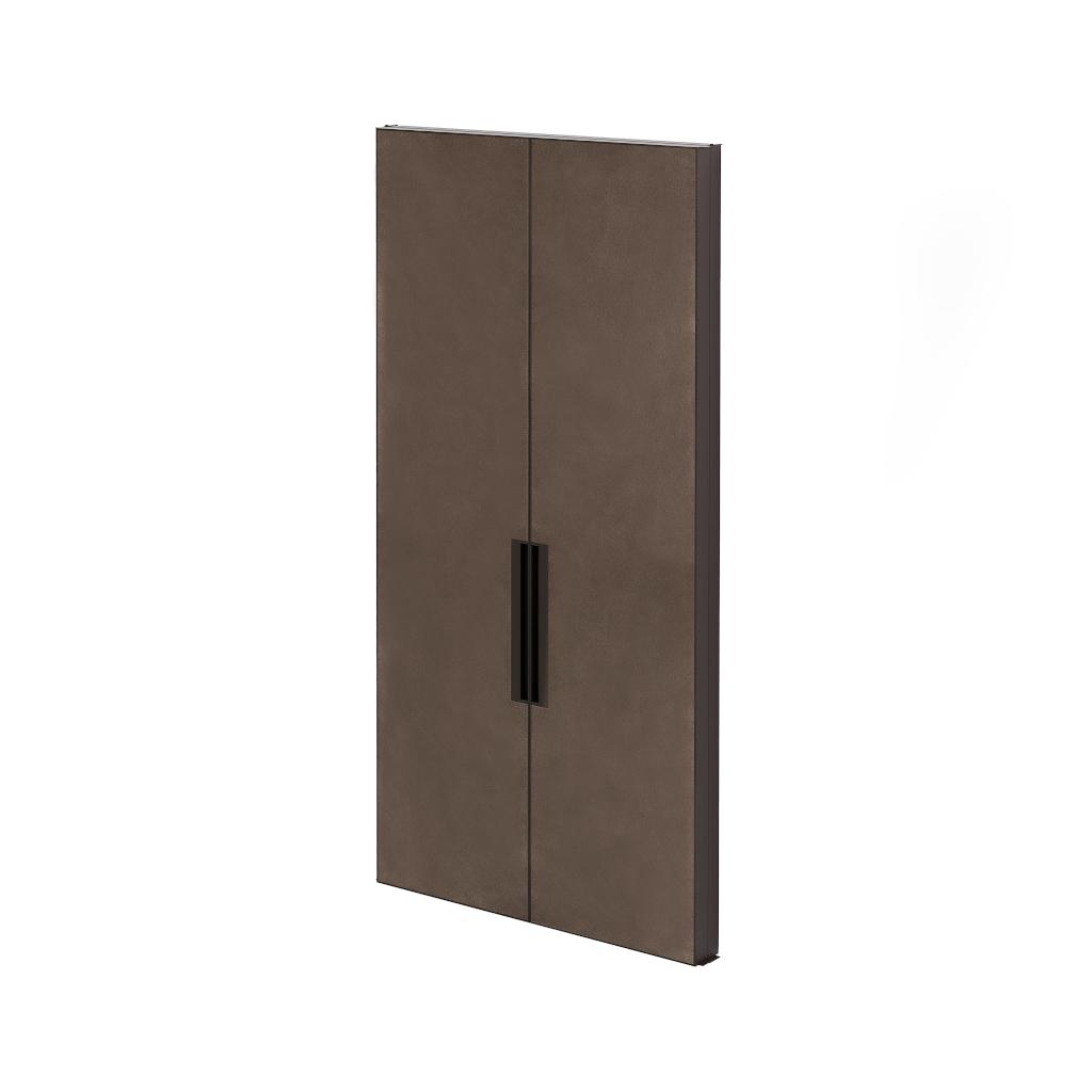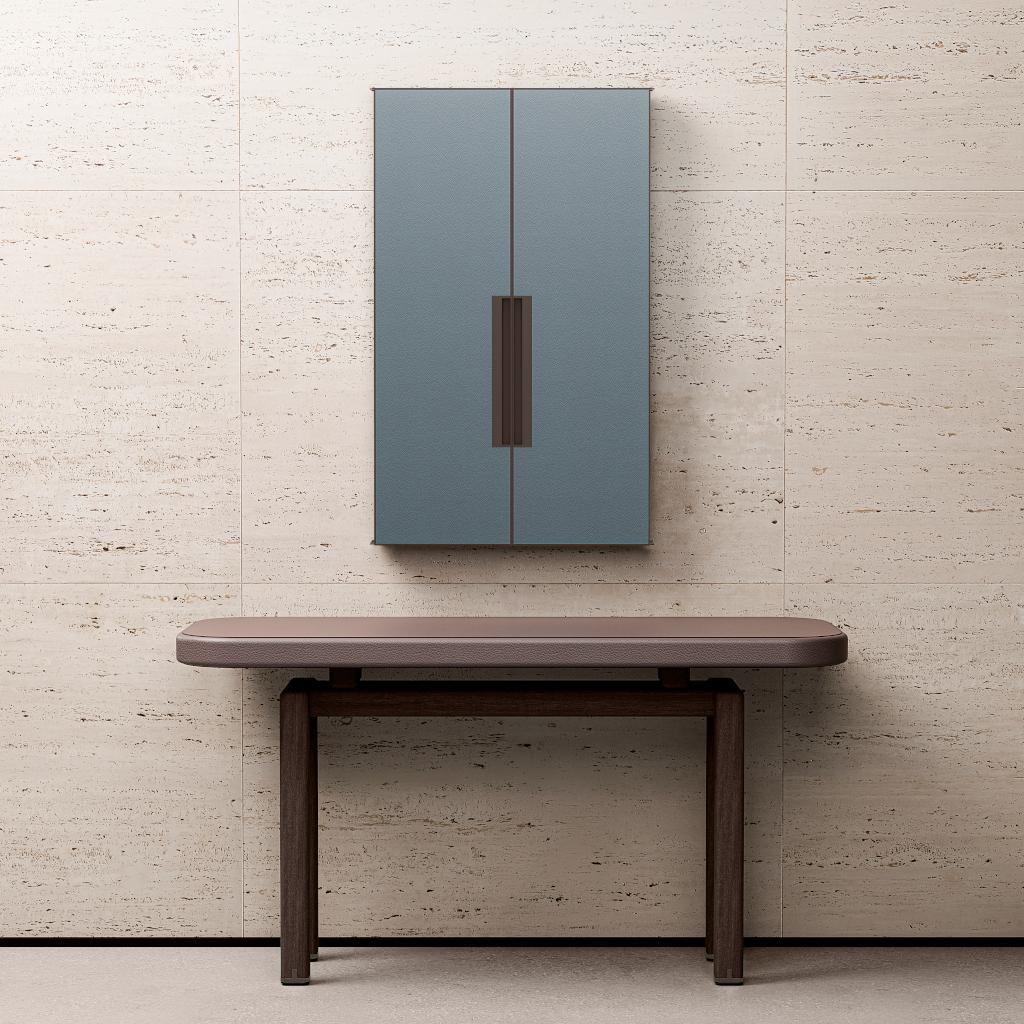 The Meraya wall mirrors express a rigorous architectural language defined by clean, disciplined lines. A burnished bronze frame outlines the structure, while leather inlays refine the doors with a tactile, crafted presence. When opened, they reveal a full mirrored surface, available