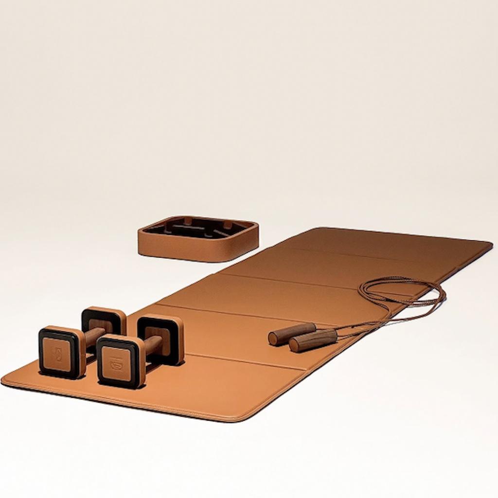 The soft mat is entirely covered in precious Pelle Frau leather. Ideal for home workout, it is foldable to be comfortably packed inside a matching leather-covered holder.