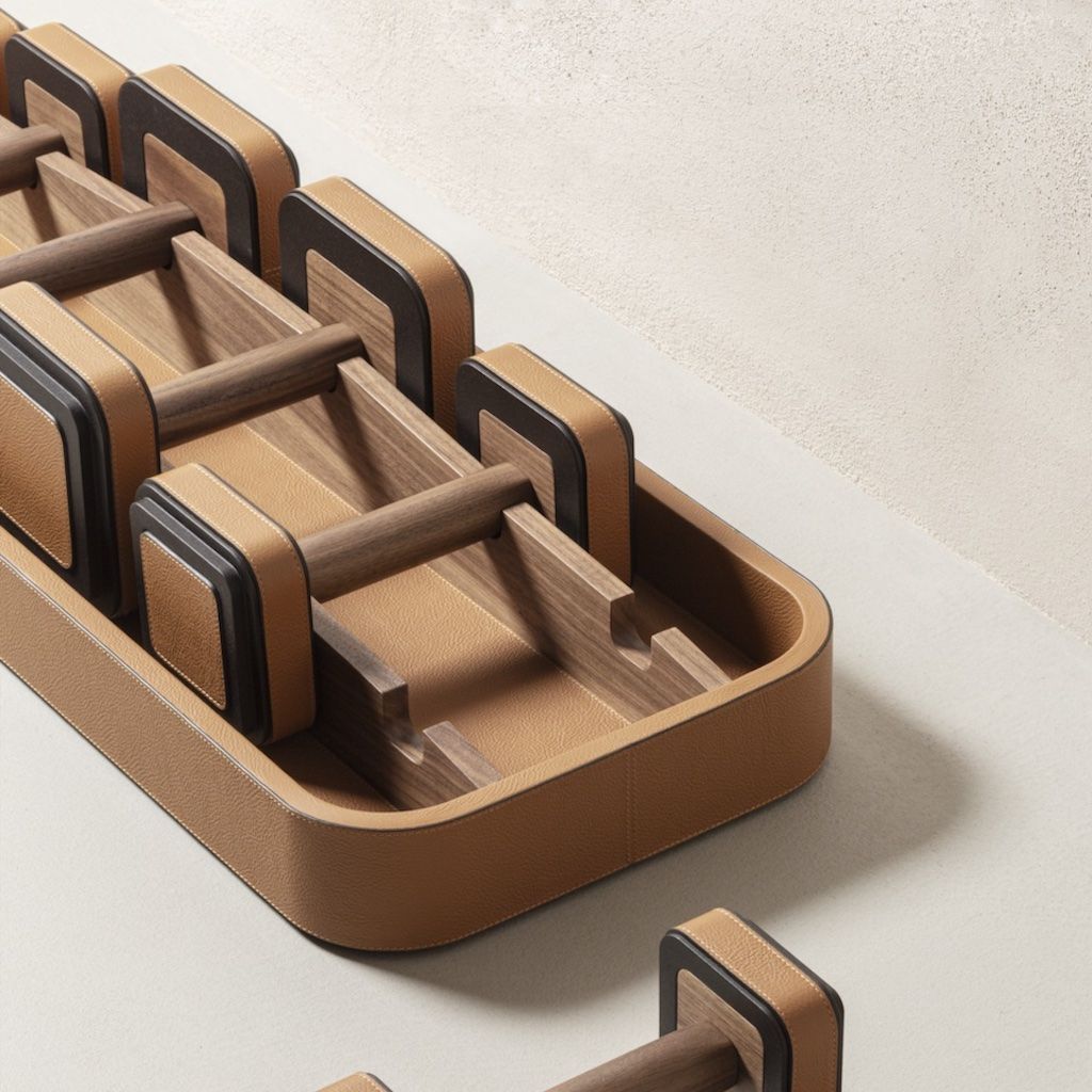 This set of weights (pairs of 2, 4, and 6 kg) is designed to be both used for exercises and, when placed in its matching leather-covered holder with !ne walnut wood inserts, as a home decor, being a stylish product that can be proudly showcased inside homes.